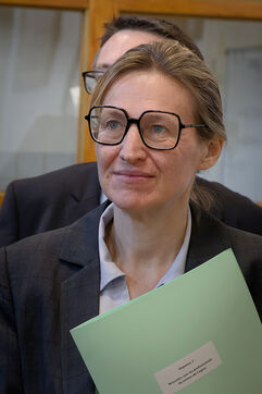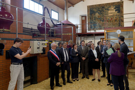 Astrid Panosyan-Bouvet, la Ministre chargée du Travail et de l'Emploi est venue en Charente, a Sireuil, France pour visiter une distillerie de cognac et discuter avec les acteurs de la filière tourmentée par la situation internationale dont les droits de douane.
