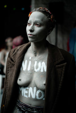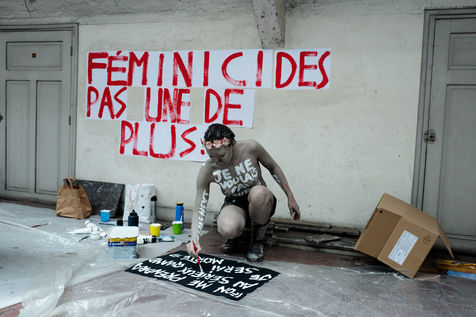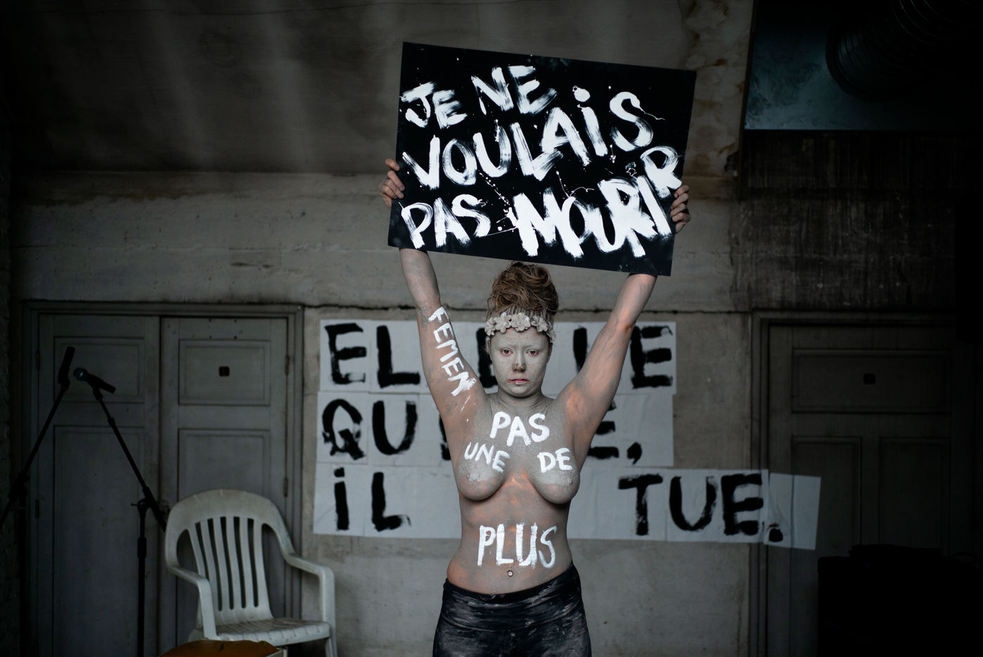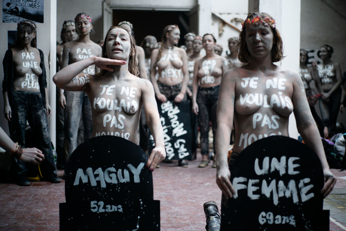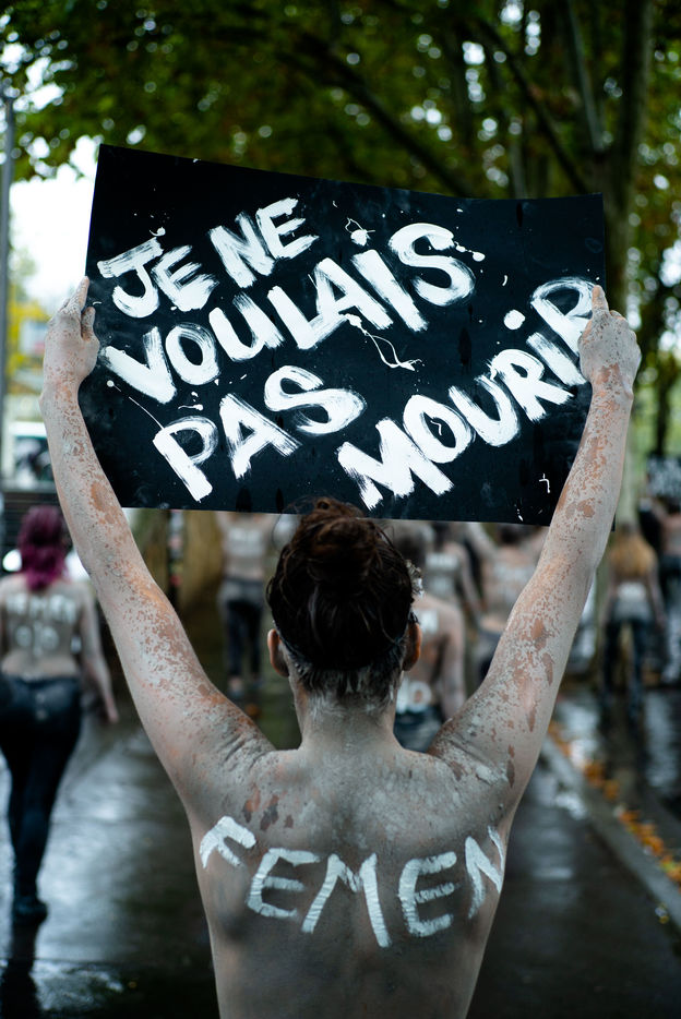 In white acrylic they wear among other things "I didn't want to die" "I left him, he killed me". Inna Shevchenko, a historical member of the Femen, gave specific training in non-violent activism (how to place yourself, hold your sign, respond to the police) for the new recruits who came in large numbers for this action.