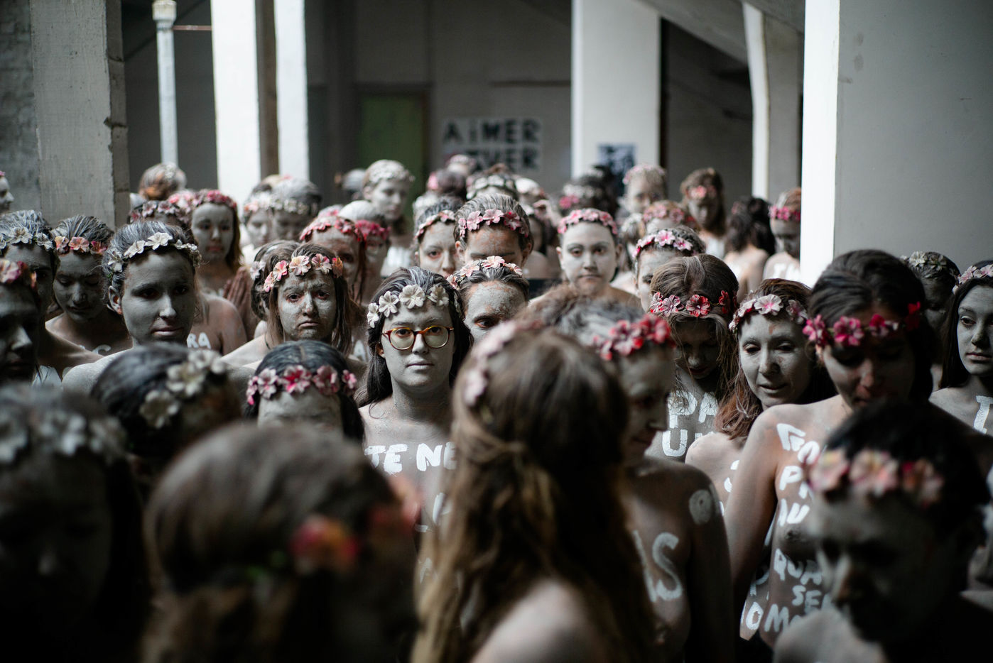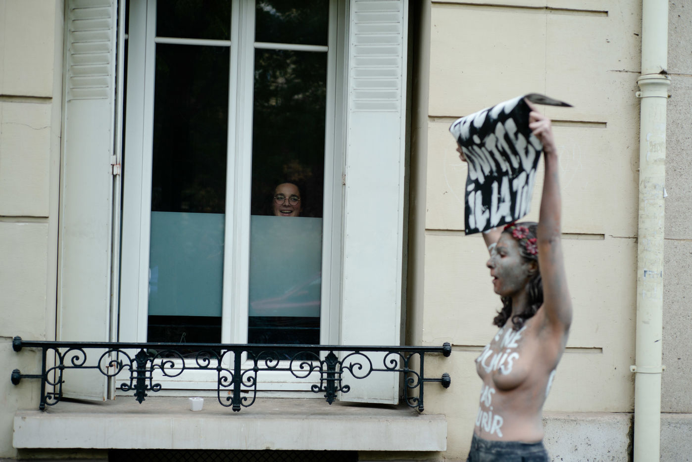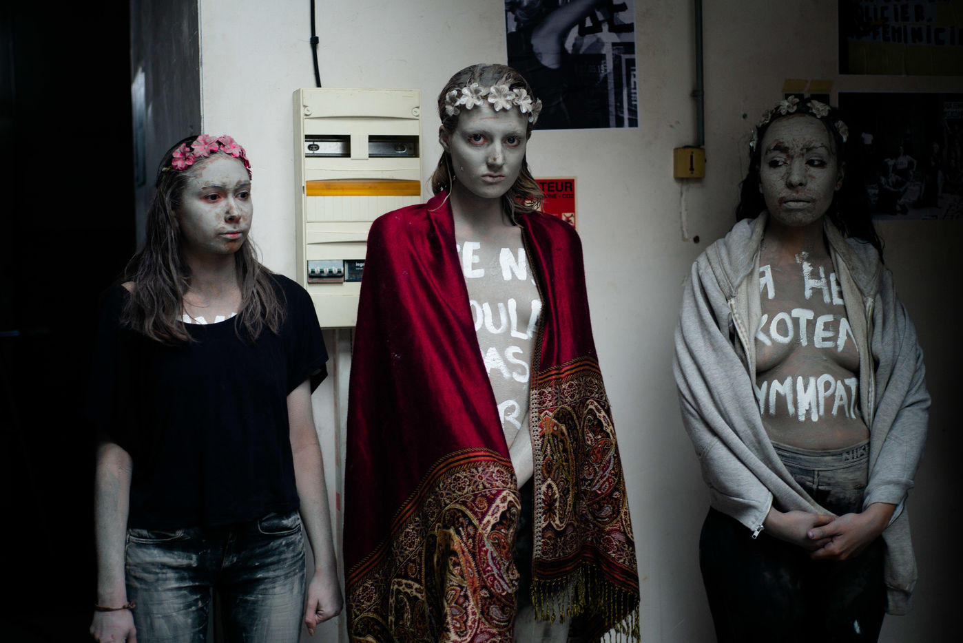 In white acrylic they wear among other things "I didn't want to die" "I left him, he killed me". Inna Shevchenko, a historical member of the Femen, gave specific training in non-violent activism (how to place yourself, hold your sign, respond to the police) for the new recruits who came in large numbers for this action.