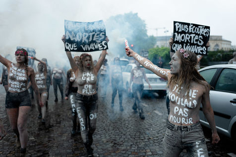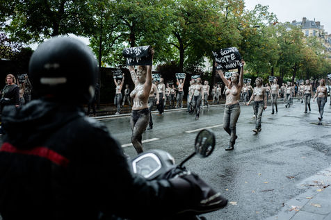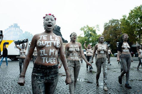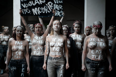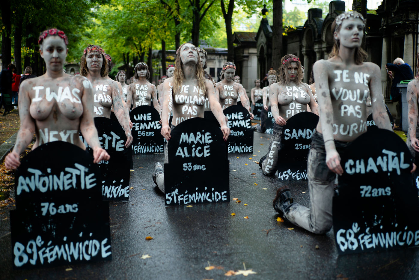 Les Femen ont défilé du boulevard Saint-Jacques jusqu'au cimetière du Montparnasse. Recouverte d'argile, pour ressembler aux femmes mortes sous les coups de leurs conjoints qui reviendraient hanter les mémoires d'une société trop passive et d'un gouvernement aux mesures insuffisantes.