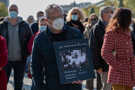 On Sunday 18 October 2020, people from Nantes gathered in Nantes to pay homage to Samuel Paty, history teacher at the College du Bois d'Aulne in Conflans-Sainte-Honorine, beheaded on 16 October 2020 by an Islamist of Chechen origin who reproached him for having shown caricatures of the Prophet Mohammed published by Charlie Hebdo to his pupils during a course on freedom of expression and the right to blasphemy. Beyond the tribute paid to the victim of this attack, this gathering initiated by trade unions whose Snes-FSU aimed to support the teaching profession, freedom of expression and to reaffirm the rejection of obscurantism.