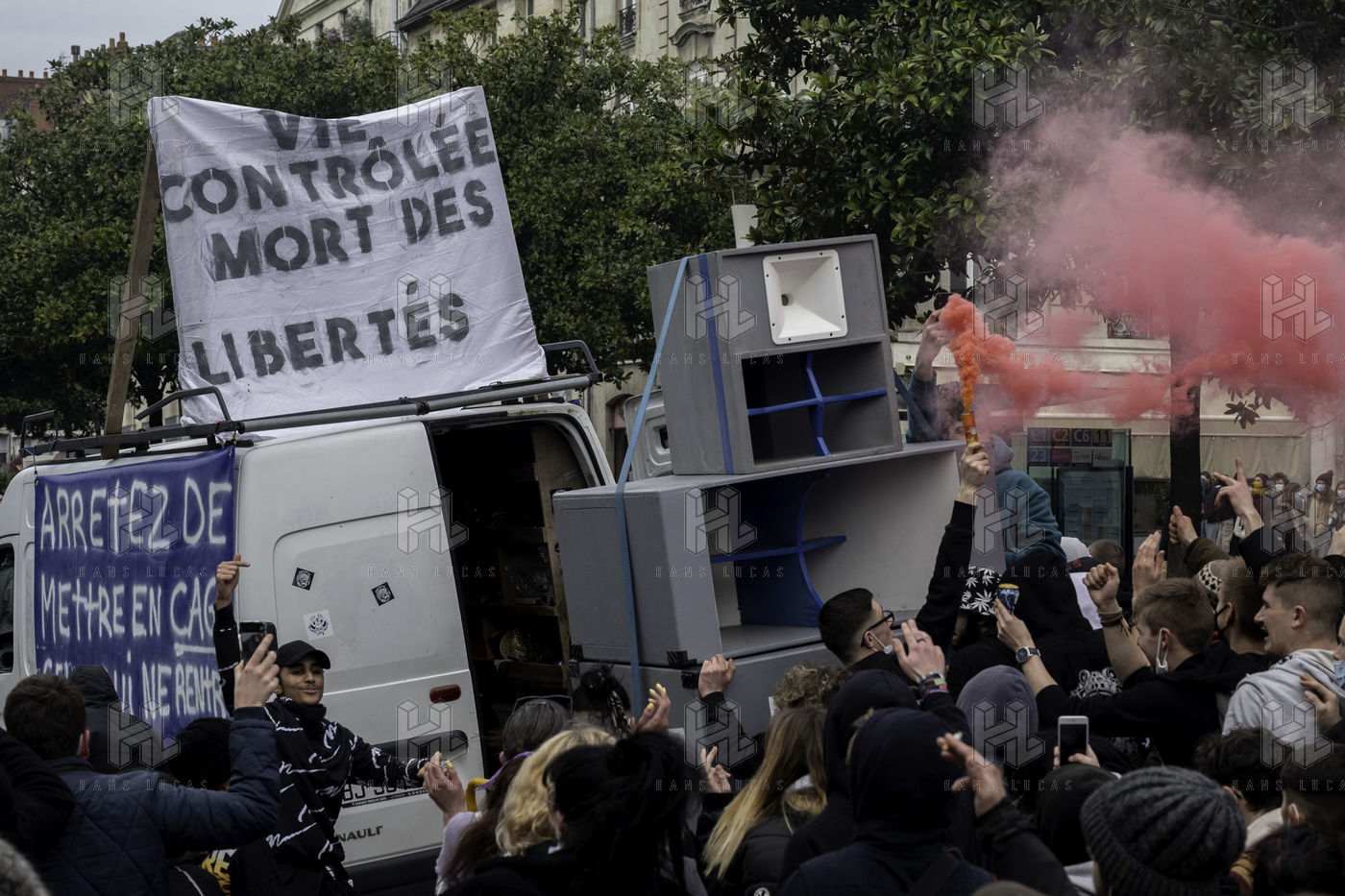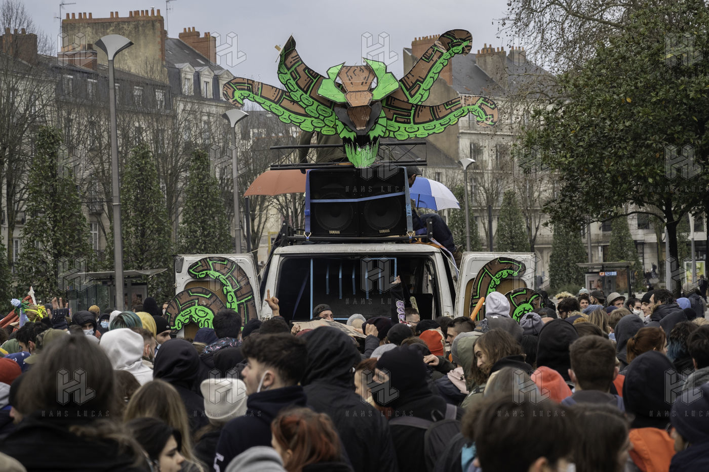 On Saturday, February 13, 2021, in support of the 9 people charged following the freeparty organized by the association Maskarade in Lieuron on New Year's Eve, hundreds of partygoers paraded through the streets of Nantes in a festive atmosphere punctuated by soundsystems. The demonstrators demanded the right to party despite the health crisis, while denouncing the repression and the repressive laws.