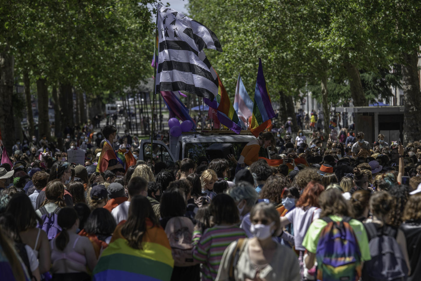 L'association rennaise Iskis a convier la communauté LGBTQI et ses soutiens a défilé dans les rues de Rennes samedi 5 juin 2021 à l'occasion de sa Marche des Fiertés annuelle et dont l'édition 2020 avait été annulée en raison de la Covid-19. Les organisateurs revendiquent l'ouverture de la Procréation Médicalement Assistée aux couples lesbiens et aux femmes célibataires, l'interdiction des thérapies de conversion, le changement d'état civil libre et gratuit pour les personnes transgenres.