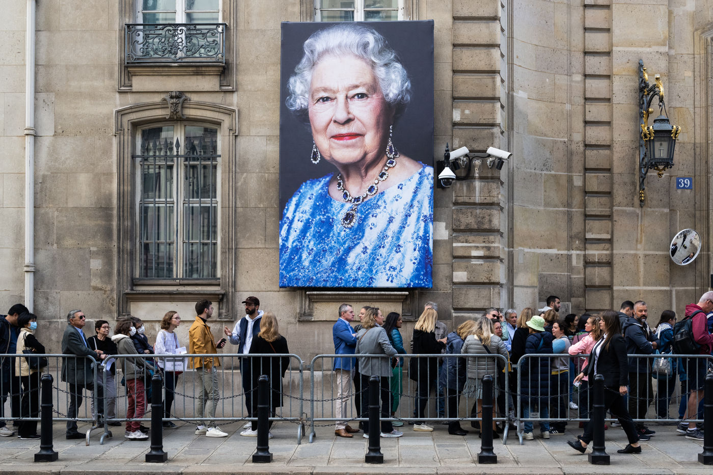 Two portraits of Queen Elizabeth II, who died on 8 September, have been placed on the façade of the British Embassy in Paris. Parisians laid flowers to pay their respects.