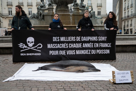 Sea Shepherd a exposé sur la place Royale de Nantes le cadavre d'un dauphin qui a victime d'une capture par un fileyeur. Les activistes souhaitaient ainsi sensibiliser le public sur les dangers de cette technique de pêche pour les delphinidés ; depuis le 1er décembre 2022, 370 cadavres de dauphins se sont échoués sur les plages.