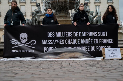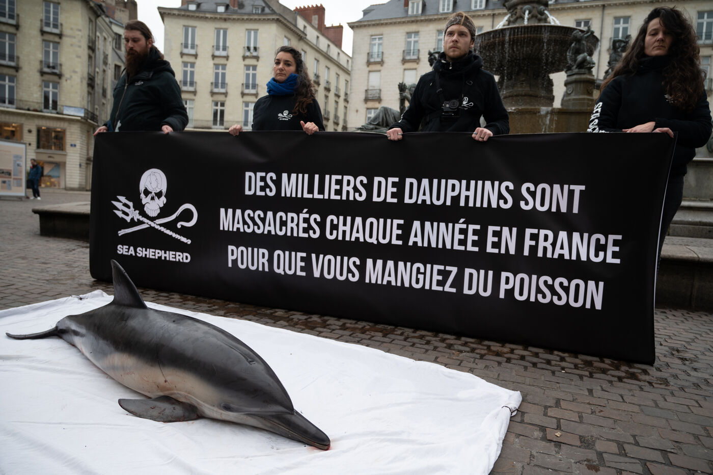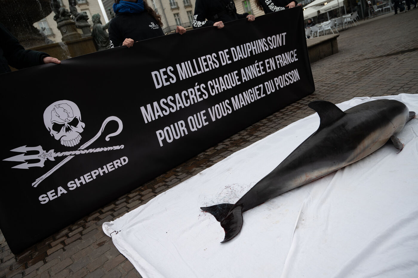 Sea Shepherd has displayed the body of a dolphin that was caught by a gillnetter in the Place Royale in Nantes. The activists wanted to raise public awareness of the dangers of this fishing technique for dolphins; since December 1, 2022, 370 dolphin corpses have washed up on the beaches.