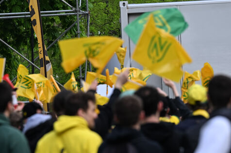 The atmosphere in the streets of Nantes as FC Nantes takes on Toulouse FC at the Stade de France for the final of the French Football Cup. For this occasion, the municipality has set up a fan zone in the city centre so that the Canaries' supporters can encourage their team which is putting its title back on the line one year after winning the French Cup 2022.