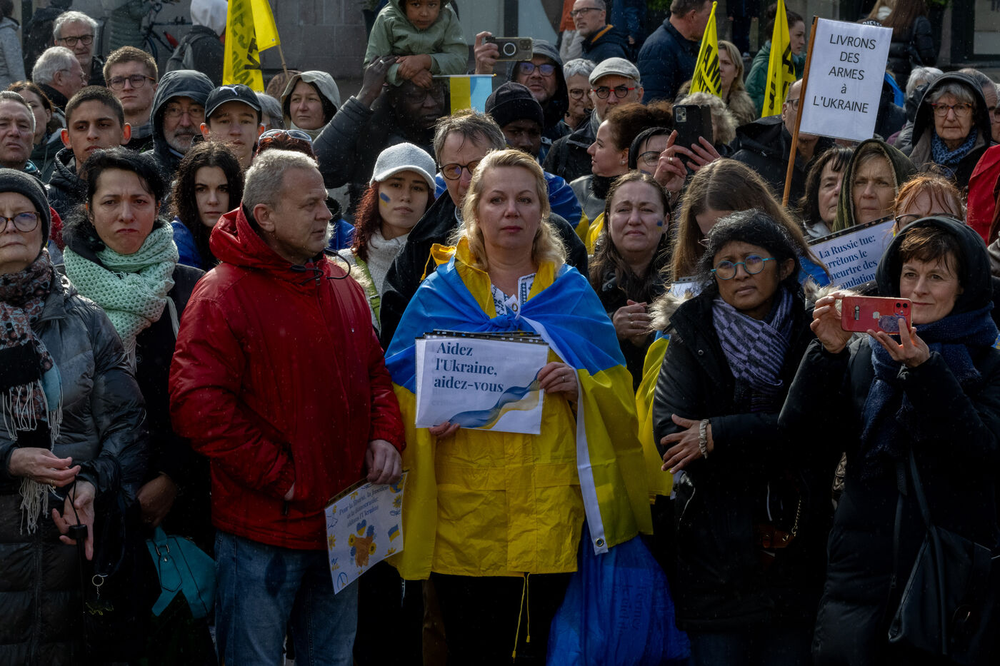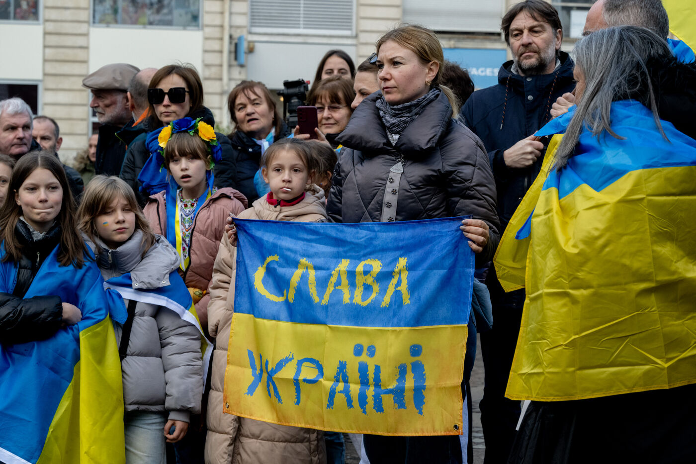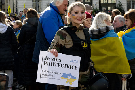 La diaspora ukrainienne et ses soutiens ont organisé un rassemblement commémorant les deux ans de l'invasion de l'Ukraine par la Russie. Les manifestants ont également commémorer le dixième anniversaire de la révolution Euromaïdan durant laquelle une partie du peuple ukrainien revendiquait rapprochement avec l'Europe. Cet évènement marqua le début du conflit avec la Russie avec l'annexion de la Crimée par Poutine.