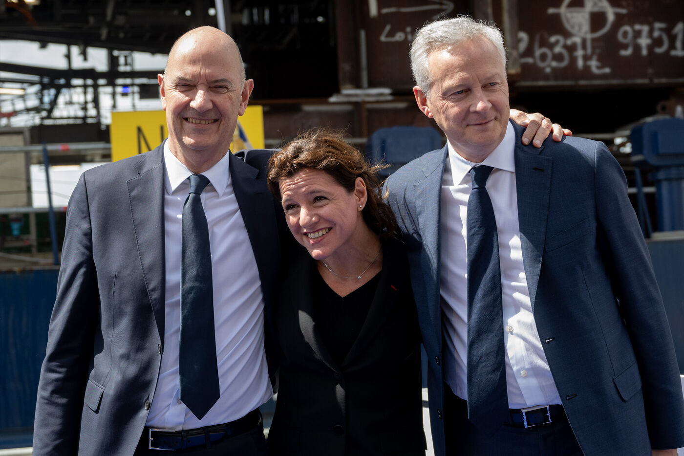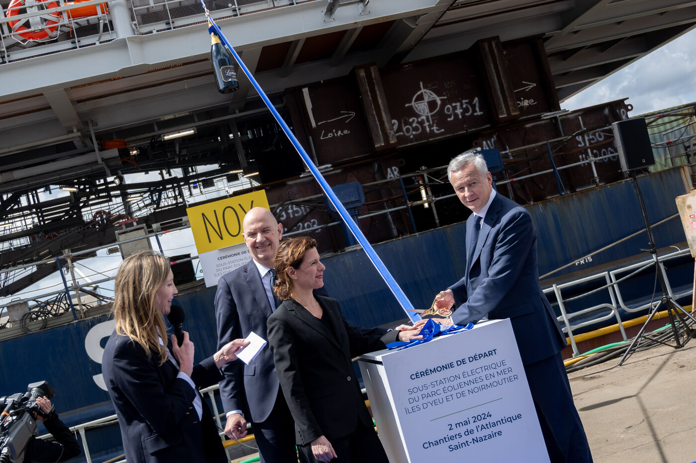 Bruno Le Maire, Ministre de l'Economie et des Finances et Roland Lescure Ministre délégué chargé de l'Industrie étaient aux Chantiers de l'Atlantique de Saint-Nazaire jeudi 2 mai 2024 à l'occasion de la signature du contrat entre RTE et le consortium Chantiers de l'Atlantique-Hitachi Energy prévoyant la construction de postes électriques destinés au déploiement de l'éolien offshore. Ils ont ensuite assisté à la cérémonie de départ de la sous-station électrique d'Engie déstinée à collecter l'électricité produite par le parc éolien des îles d'Yeu et de Noirmoutier.