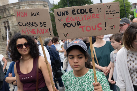 Around a thousand teachers and parents demonstrated in Nantes (France) on Saturday 25 May 2024 in response to a call from all the education unions against Gabriel Attal's "Knowledge Shock" reform. The demonstrators were mainly opposed to the introduction of level groups at collège.