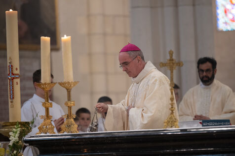 Monsignor Percerou, Bishop of Nantes (France), celebrated mass in the Basilica of Saint-Donatien on Wednesday 23 April 2025 to commemorate the pontificate of Pope Francis (Jorge Bergoglio), who died in the Vatican on 21 April 2025. Many faithful attended the service to pay their last respects to the pontiff, who died at the age of 88.