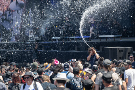 Face à la canicule qui s'abat sur la Loire-Atlantique, les bénévoles du Hellfest arrosent les festivaliers pour les rafraichir. Photo prise le 20 juin 2025 à Clisson.