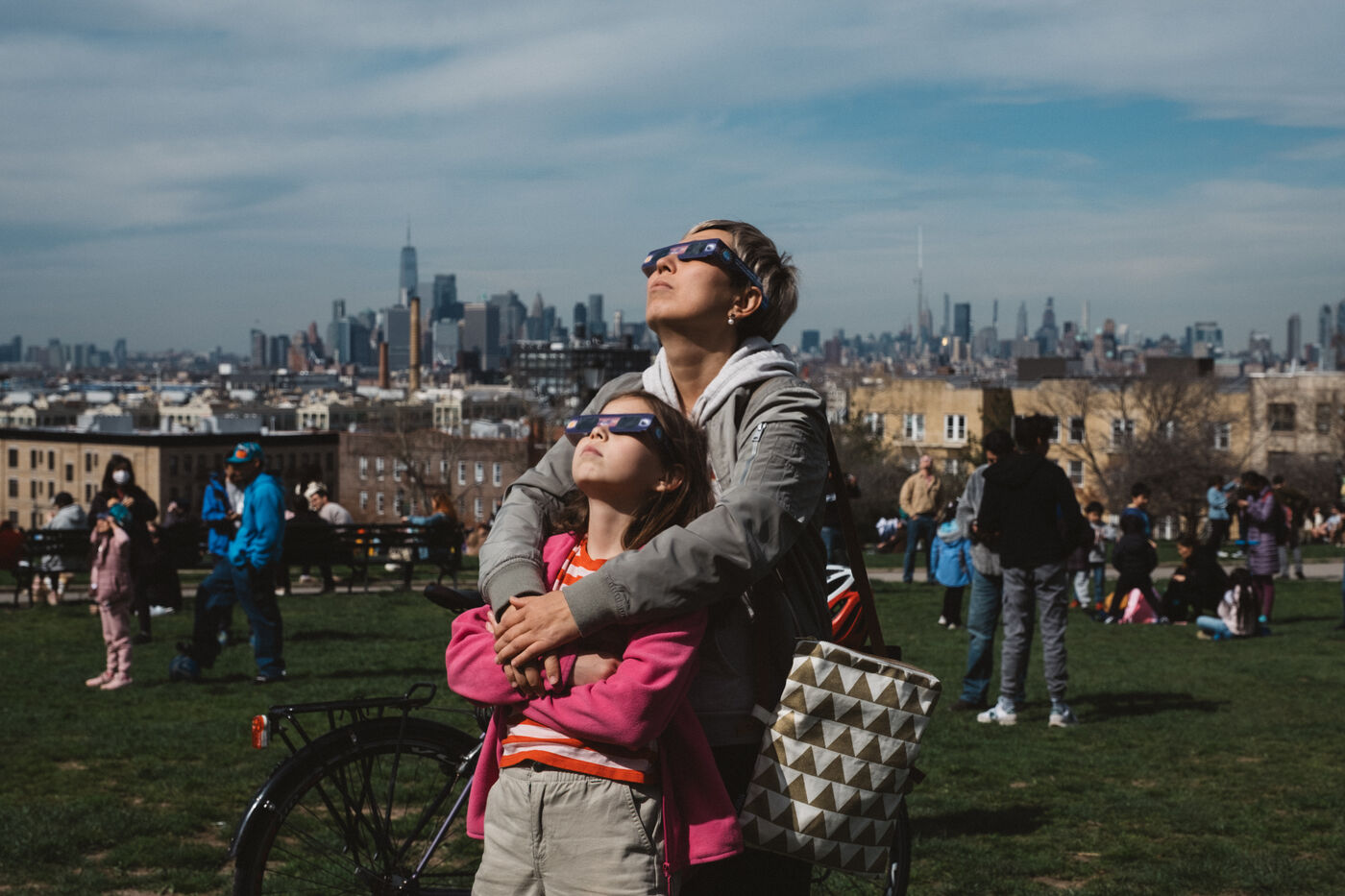 People gathered in New York City to see a partial solar eclipse, with the moon covering about 90 percent of the sun.