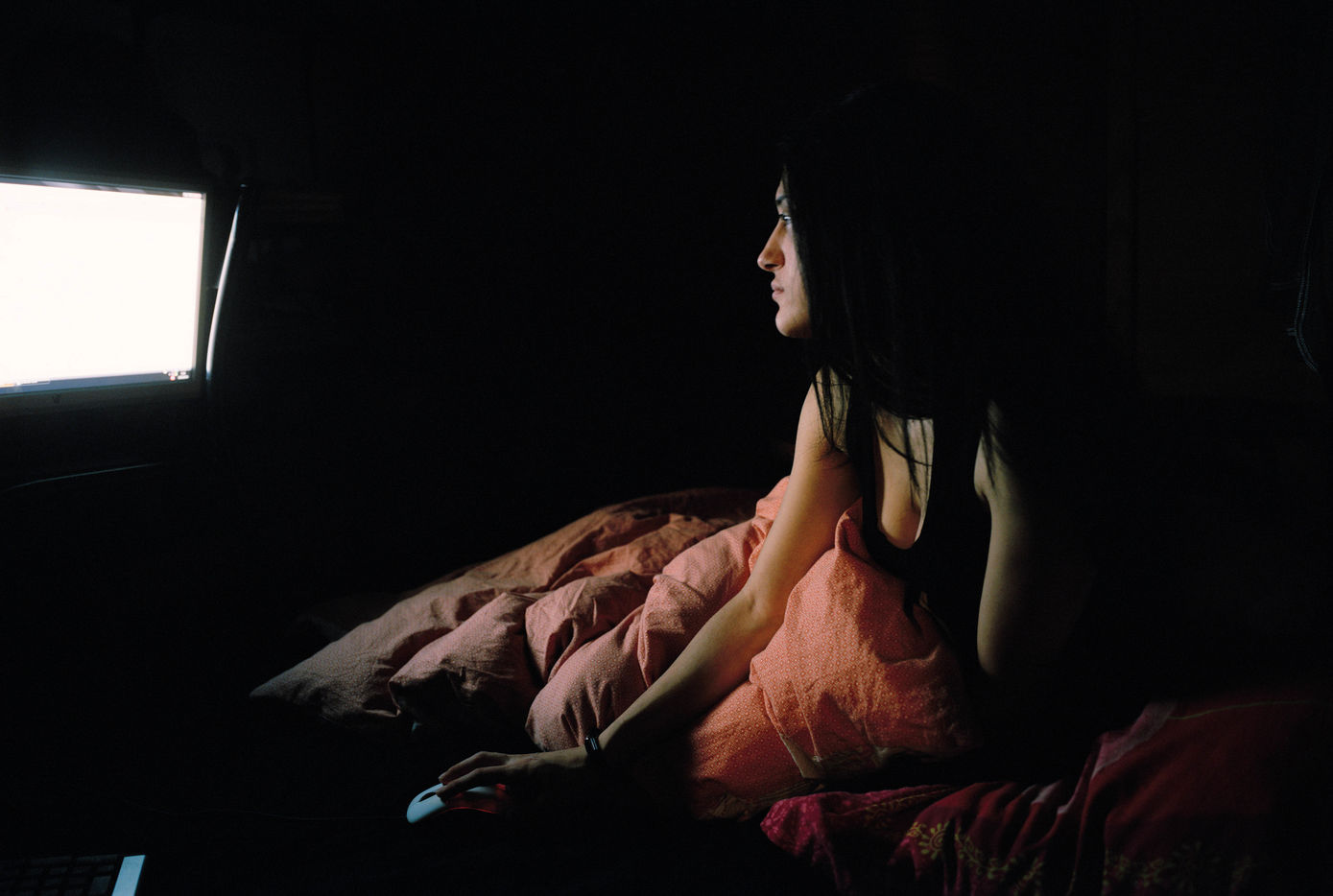 Fascinée par les thématiques de la ville et de la nuit, elle pousse les portes des habitats parisiens. Quand la ville s'endort, l'individu s'adonne au silence et à la froideur des activités nocturnes. A l'image de son écran, partenaire d'insomnies, il se met en Veille. Des images lentes, intimes, presque immobiles, portées par une réflexion sur notre monde contemporain.