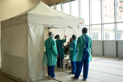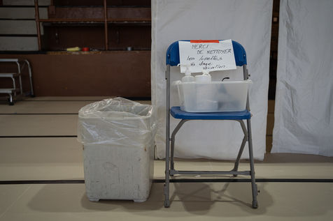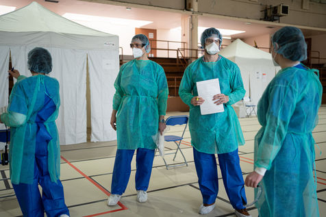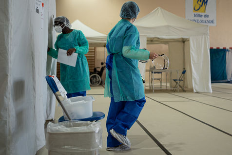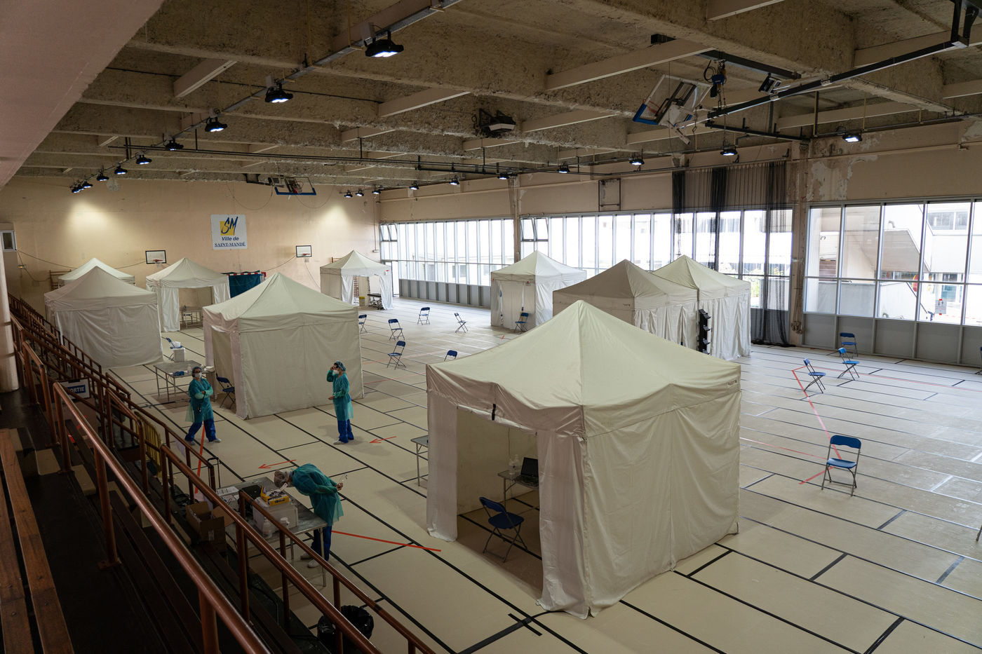 Le sol est recouvert de tatamis, mais ce n'est plus pour y pratiquer du judo, du karaté, ou tout autre art-martial. À l'initiative des médecins libéraux de Saint-Mandé/Vincennes le gymnase Roger Vergne voit défiler depuis quelques jours 30 à 40 personnes potentiellement atteintes du Covid-19. Sur les murs des affiches leur demandent de garder les mains sur les épaules, afin de ne rien toucher. Sur le sol, le chemin leur est montré par des flèches en scotch rouge. À chaque étape, une table, un écriteau stipulant "ne pas toucher la table", et un flacon de gel hydroalcoolique. Entre les paniers de basket et les cages de handball on vient ici pour se faire dépister du Covid19, sur ordonnance seulement ou si l'on fait partie du personnel médical.