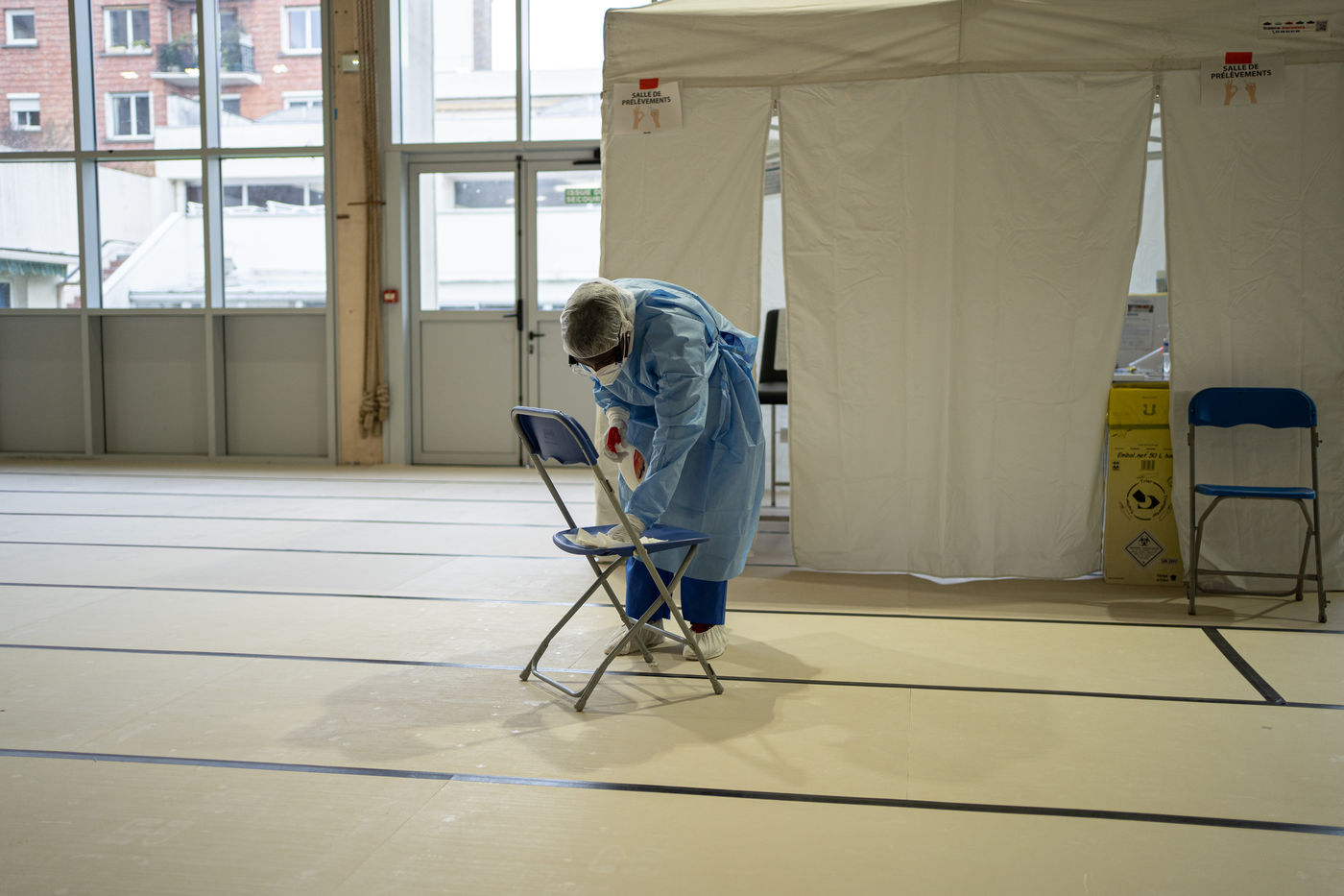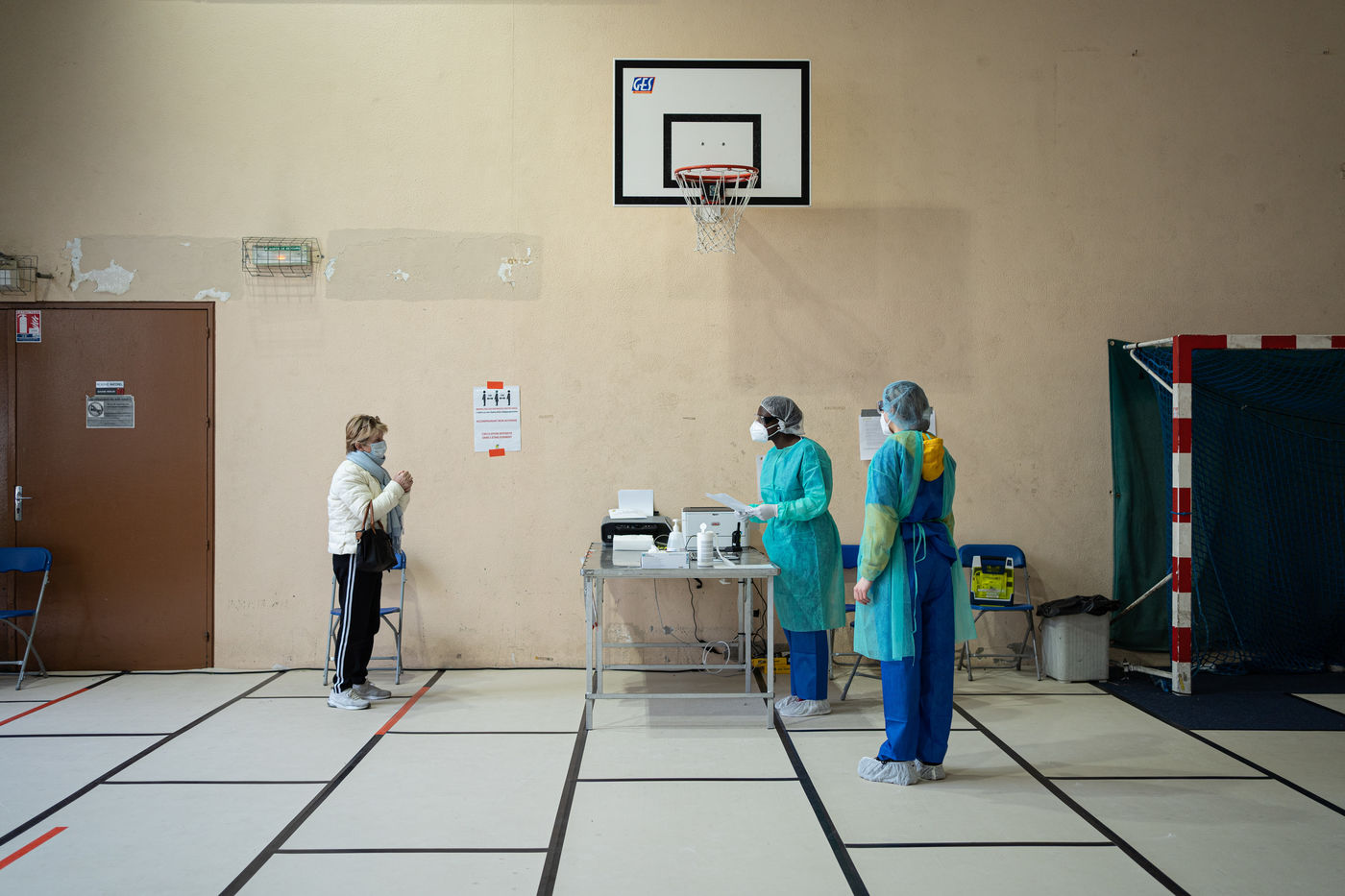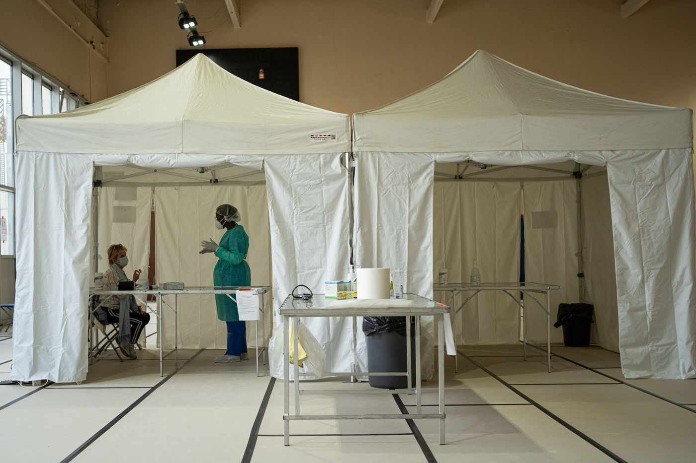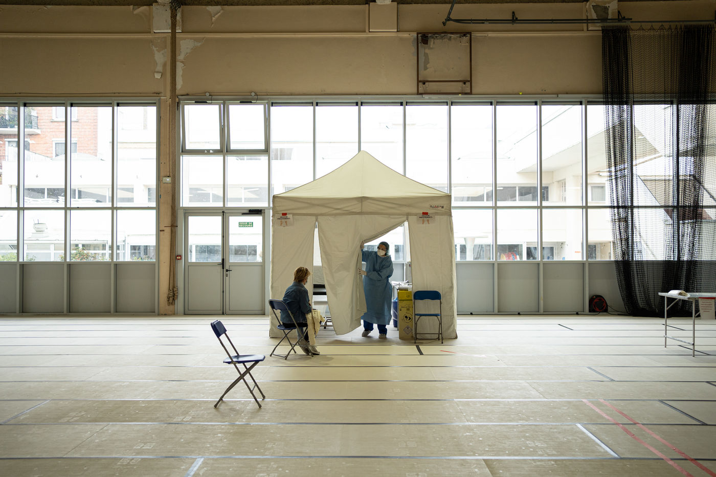 The floor is covered with tatamis, but it is no longer for practicing judo, karate, or any other martial art. On the initiative of the liberal doctors of Saint-Mandé/Vincennes, the Roger Vergne gymnasium has seen 30 to 40 people potentially suffering from Covid-19 in the last few days. On the walls posters ask them to keep their hands on their shoulders so as not to touch anything. On the floor, arrows made of red tape show them the way. At each step, a table, a sign saying "do not touch the table", and a bottle of hydroalcoholic gel. Between the basketball baskets and the handball cages one comes here to get tested for Covid19, by prescription only or if one is a medical staff member.