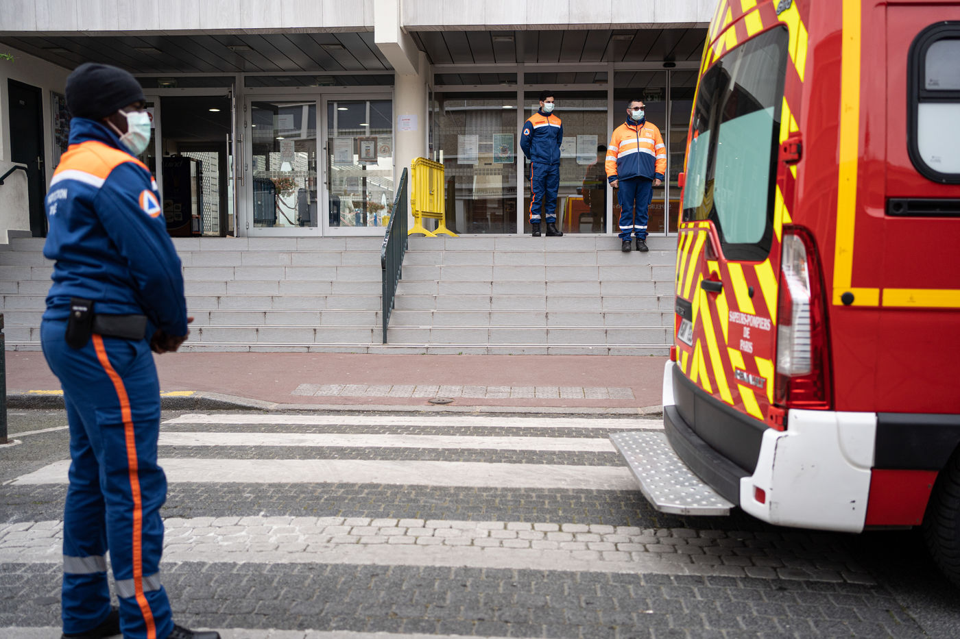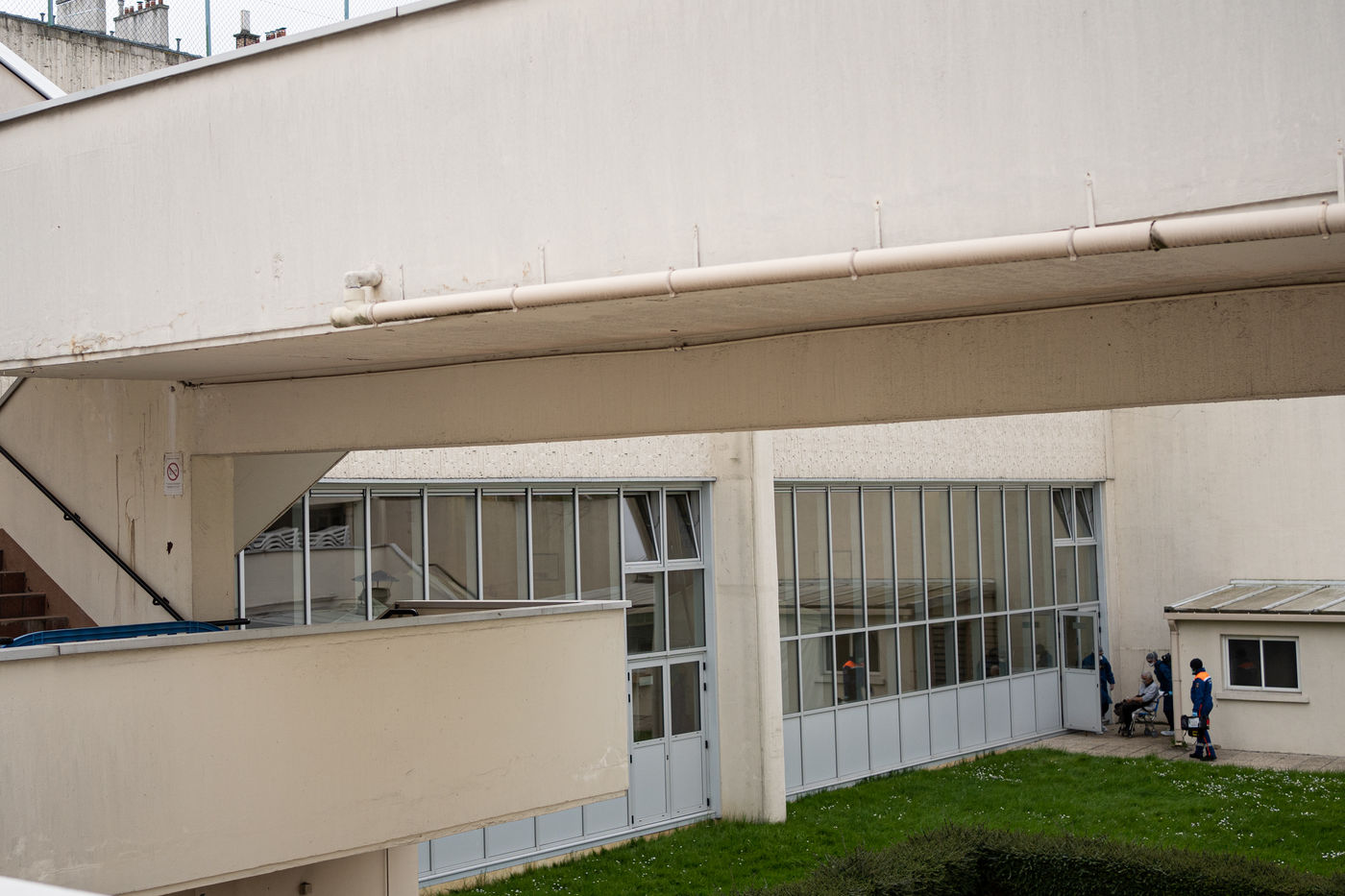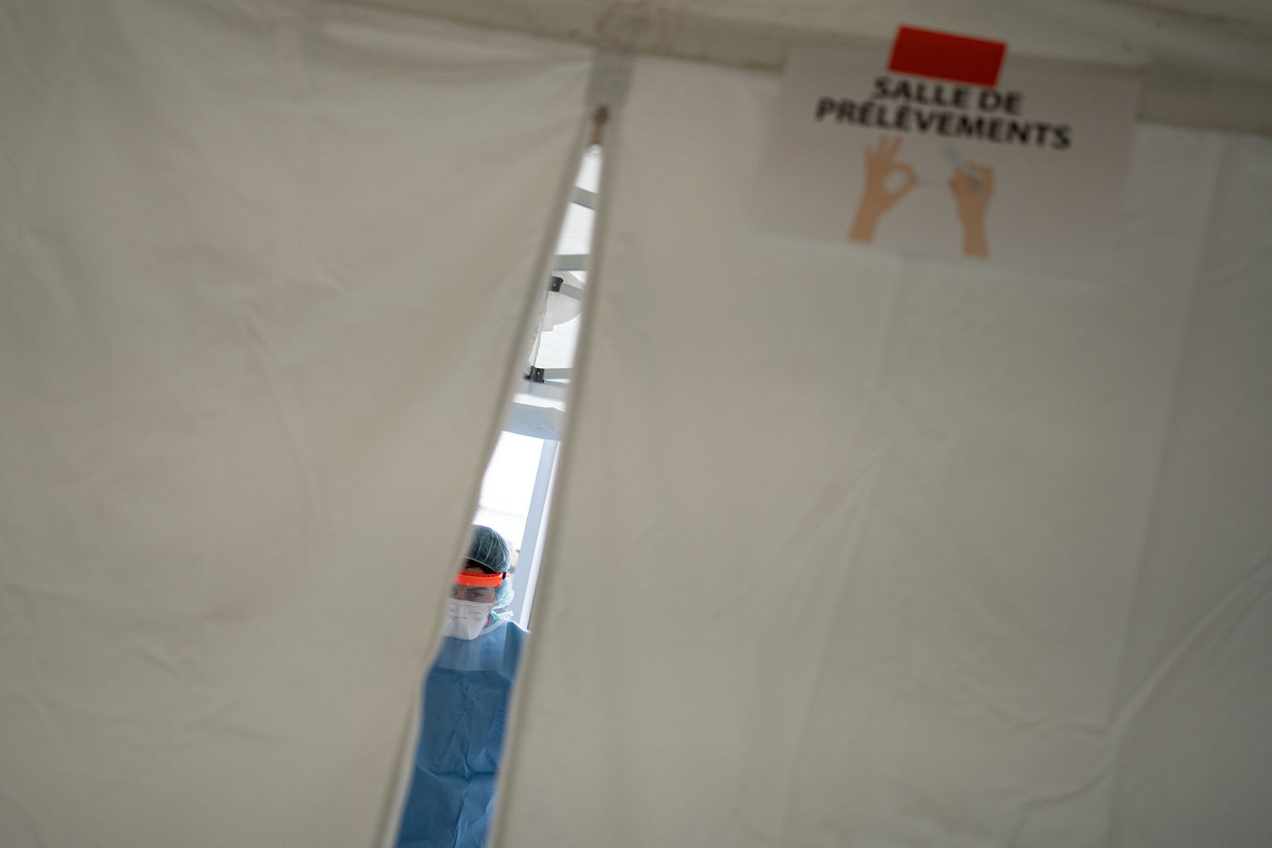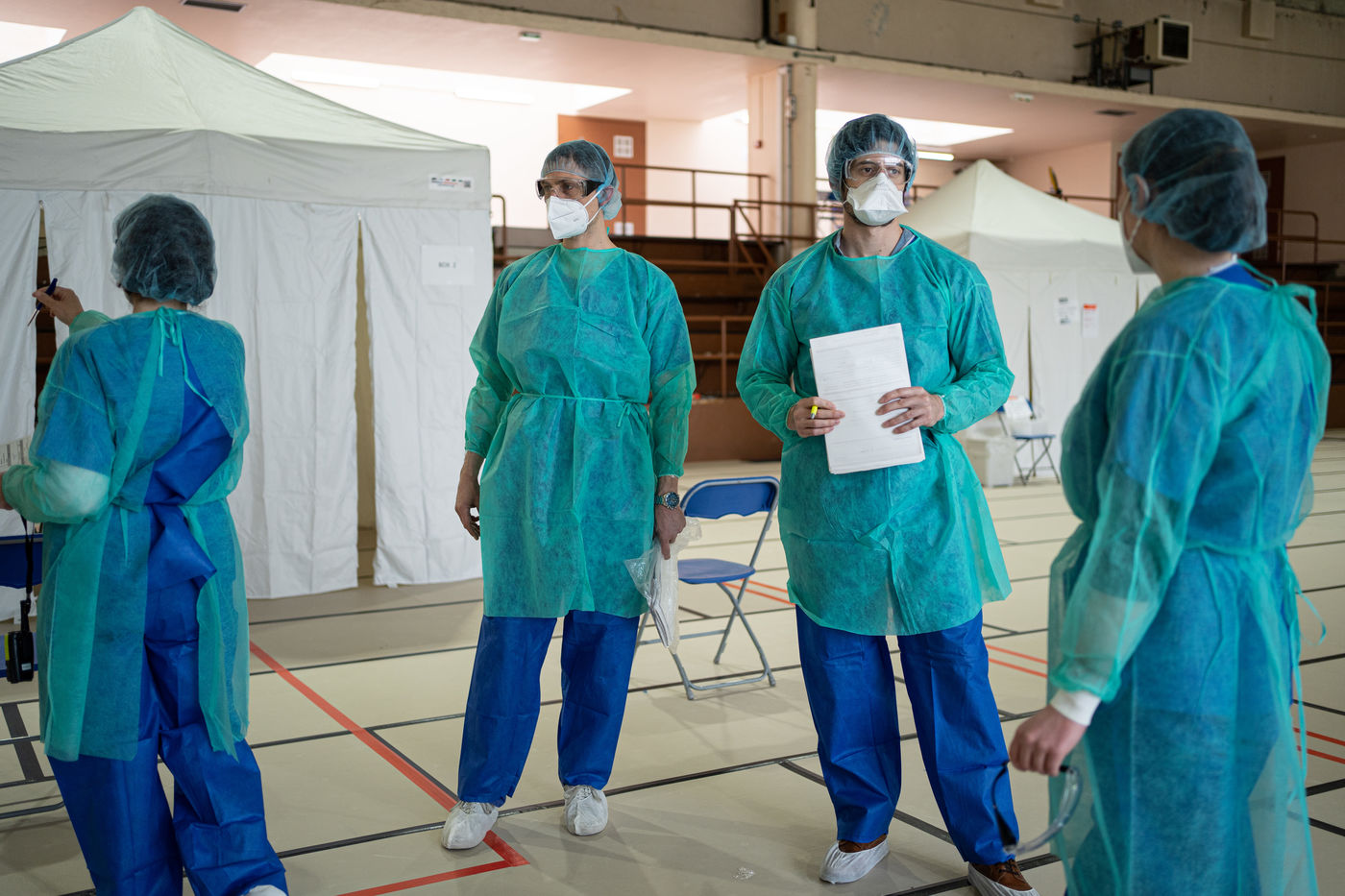 The floor is covered with tatamis, but it is no longer for practicing judo, karate, or any other martial art. On the initiative of the liberal doctors of Saint-Mandé/Vincennes, the Roger Vergne gymnasium has seen 30 to 40 people potentially suffering from Covid-19 in the last few days. On the walls posters ask them to keep their hands on their shoulders so as not to touch anything. On the floor, arrows made of red tape show them the way. At each step, a table, a sign saying "do not touch the table", and a bottle of hydroalcoholic gel. Between the basketball baskets and the handball cages one comes here to get tested for Covid19, by prescription only or if one is a medical staff member.