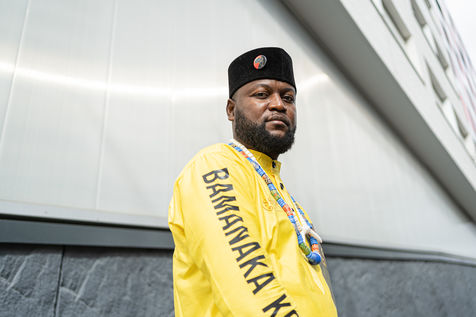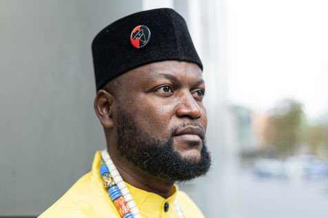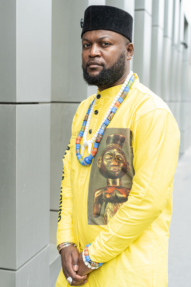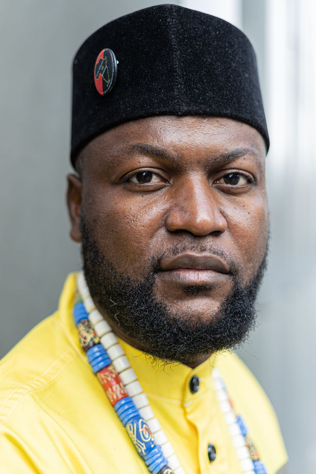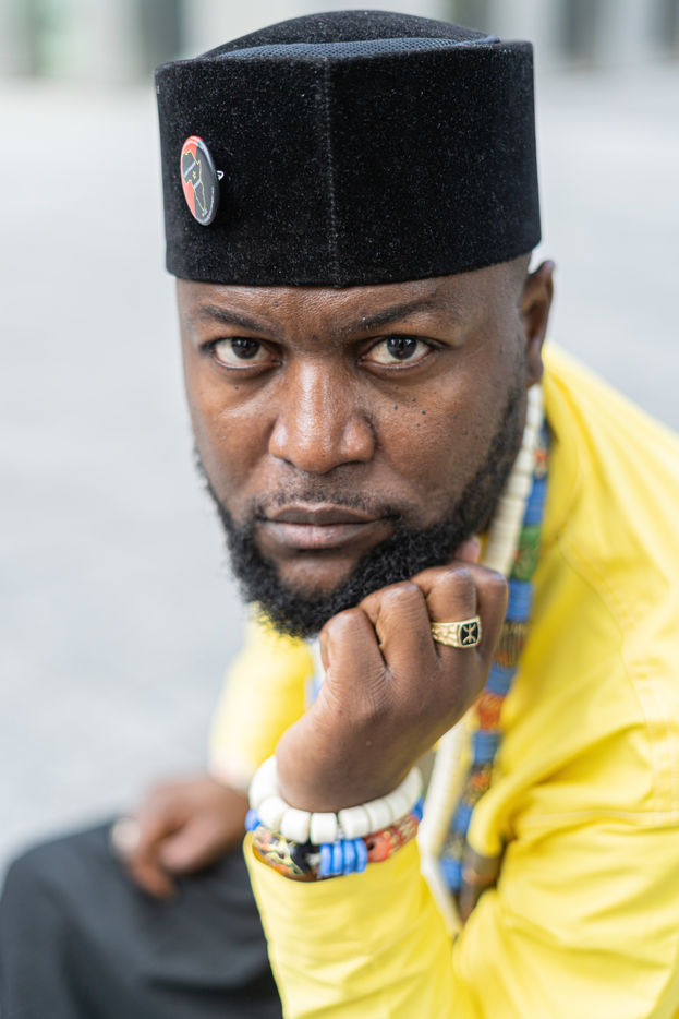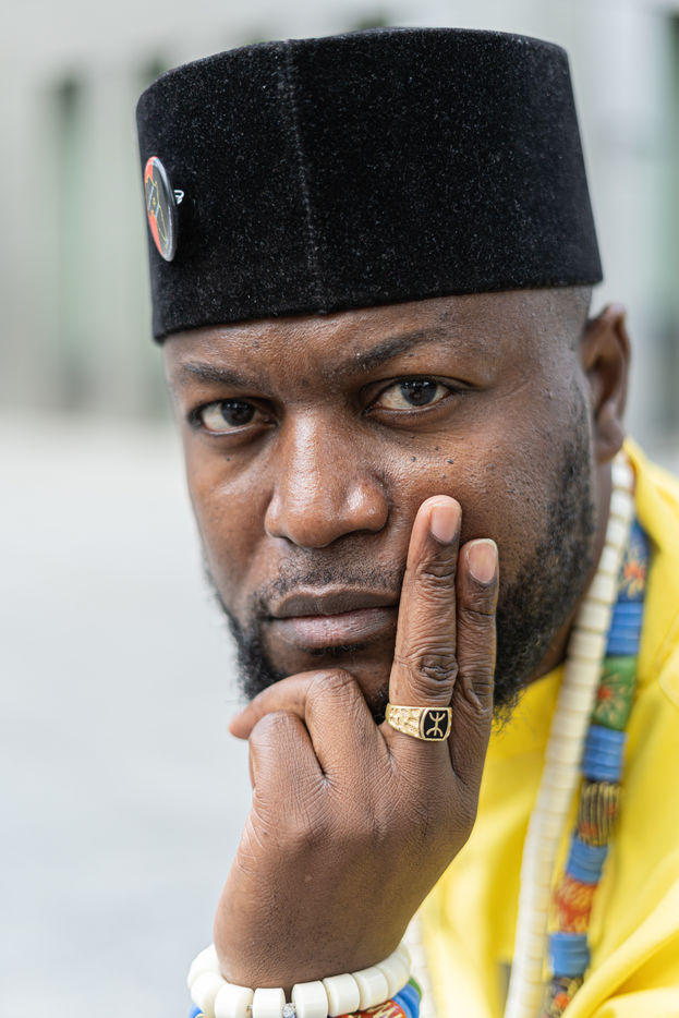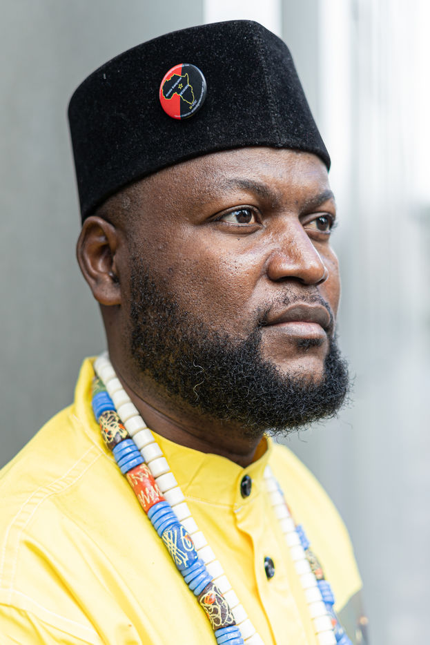 Portraits de Mwazulu Diyabanza à Paris. Cet activiste congolais est jugé à Paris pour avoir dérobé un poteau funeraire tchadien au musée du Quai-Branly. Il entend ainsi protester contre l accaparement par les pays occidentaux de biens culturels africains. Il a conduit des actions similaires à Marseille et à Berg en Dal aux Pays-Bas.