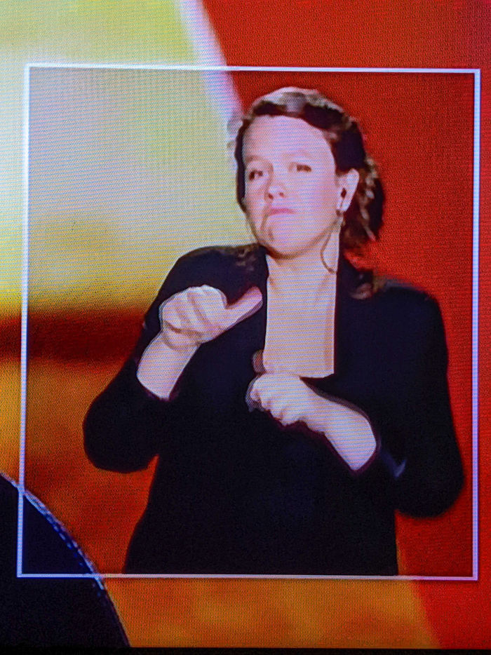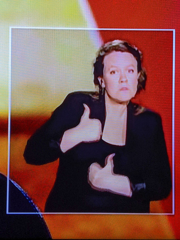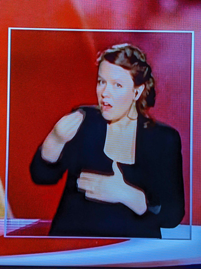 Focus on the sign language interpreter during the televised debate between Emmanuel Macron and Marine Le Pen. Screenshot.