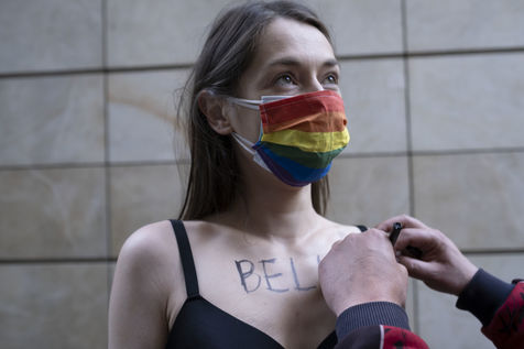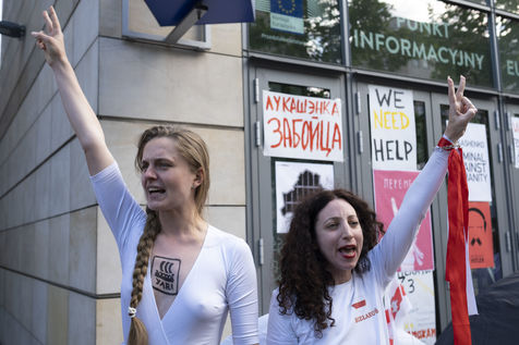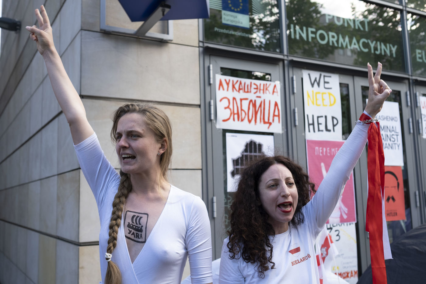Des femmes biélorusses ont organisé un happening afin de dénoncer les sociétés qui collaborent avec la Bielorussie. Cinq citoyens biélorusses ont entamé une grève de la faim, devant le siège du parlement européen à Varsovie, en signe de protestation pour soutenir le journaliste de l opposition Roman Protassevitch, détenu par Alexander Lukashenko, en Biélorussie.