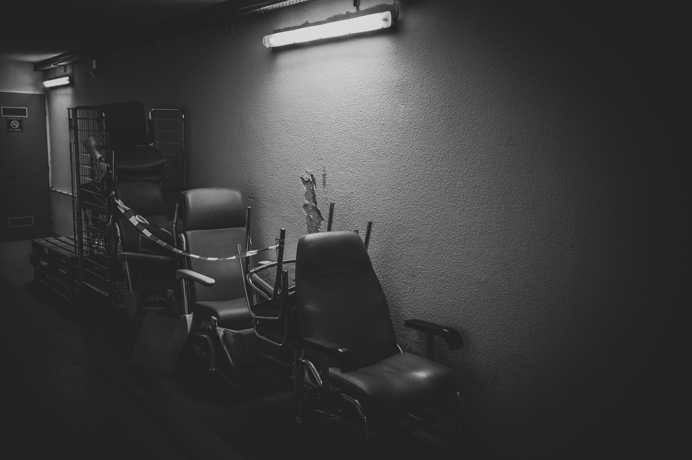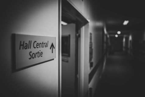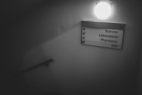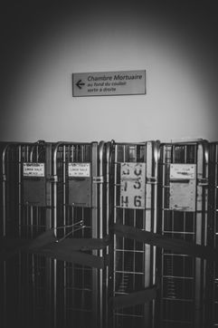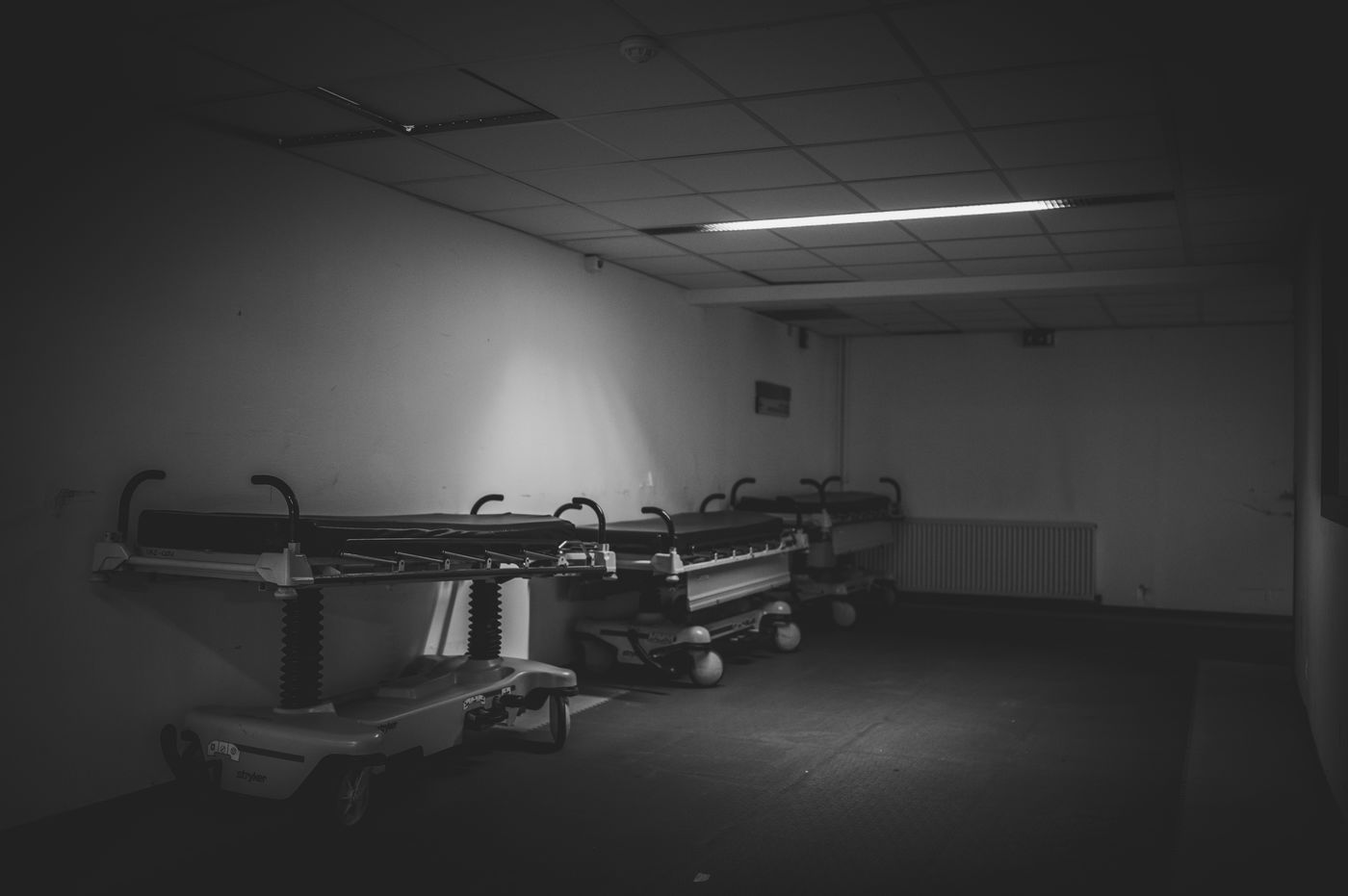 La nuit, les couloirs froid du centre hospitalier de Grasse, se vident peu à peu. Malgrés une mobilisation du personnel d'étage ininterrompu, le sous sol lui, devient desert. Dortoir pour brancard, chaises et esprits vagabons. Avril 2020.