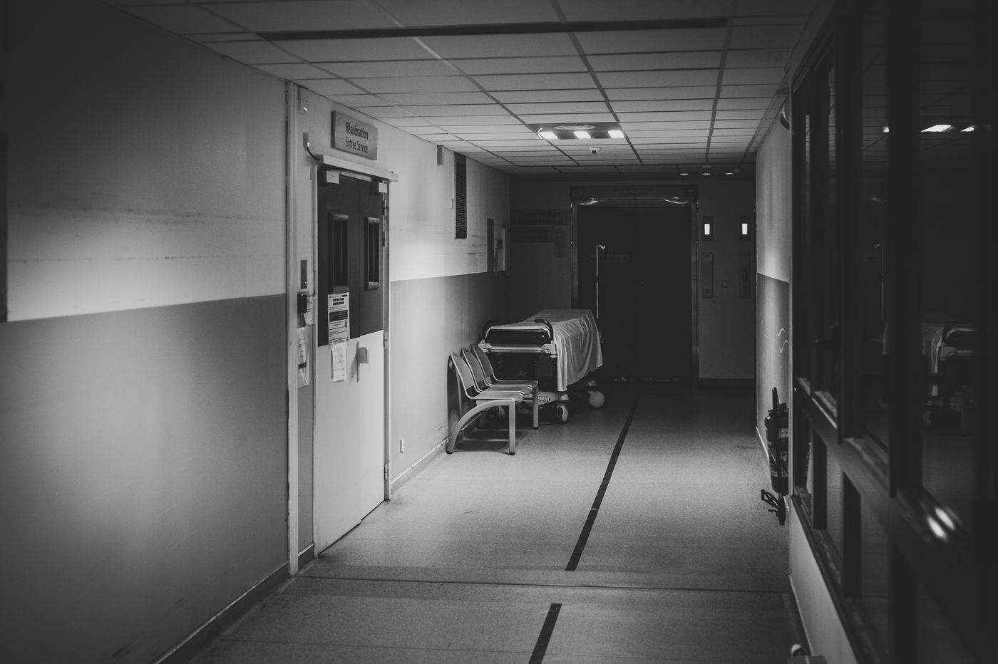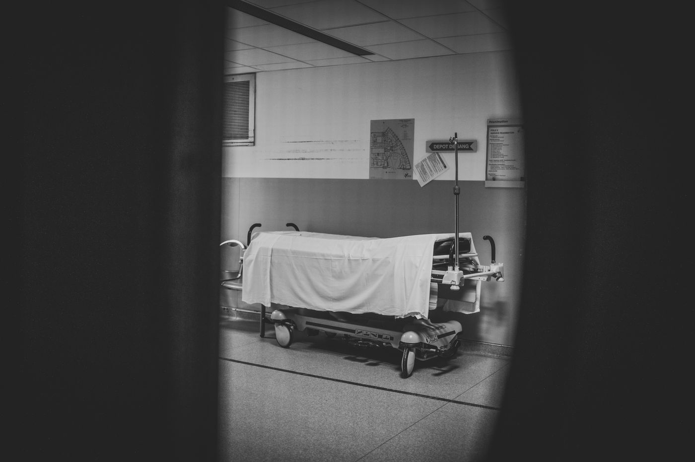 At night, the cold corridors of the hospital centre of Grasse, empty little by little. Despite the uninterrupted mobilization of the floor staff, the basement becomes deserted. Dormitory for stretchers, chairs and wandering spirits. April 2020.