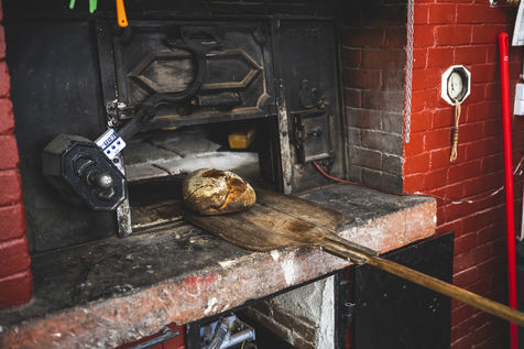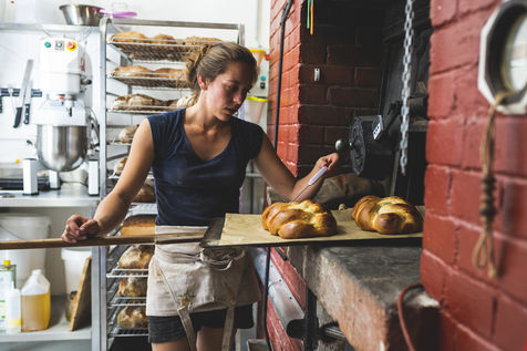 Avant la mise en four, préalablement chauffe, Cecile pèse, coupe et met en forme les pains.