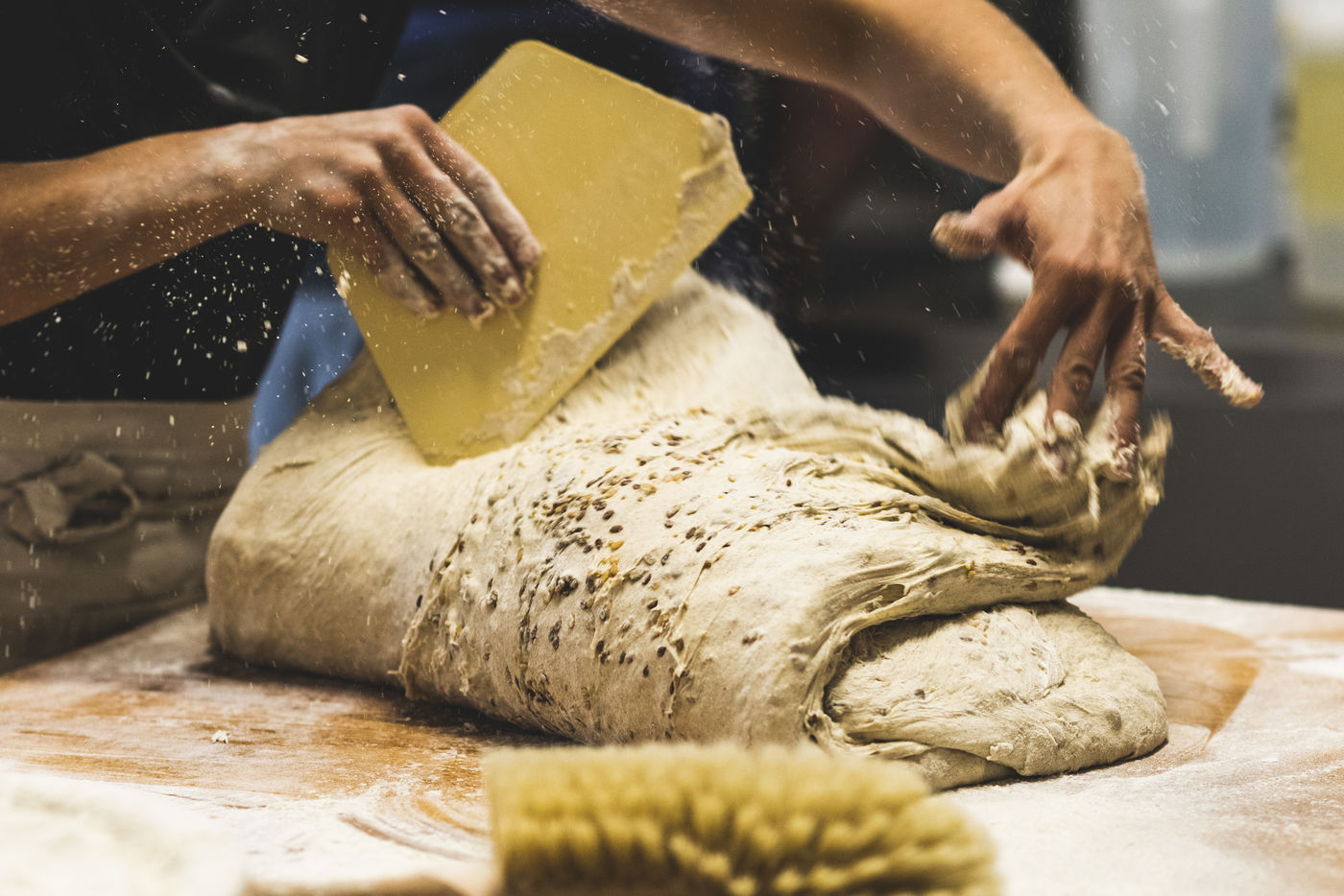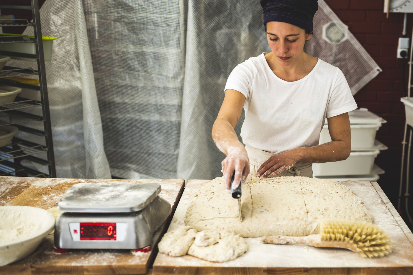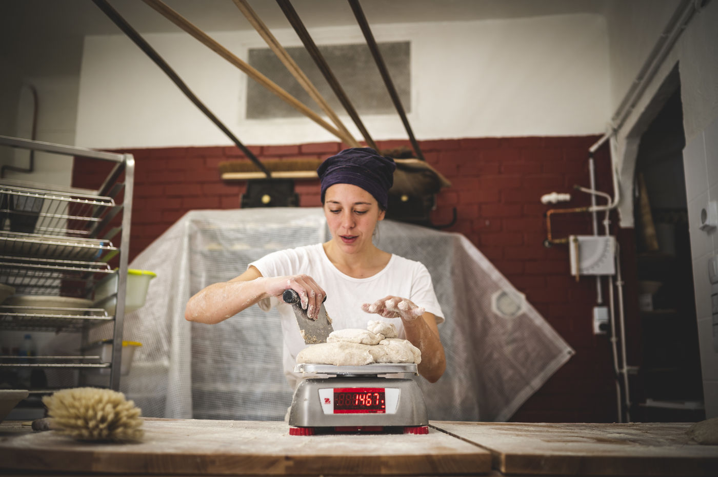 Before putting the dough in the oven, Cecile weighs, cuts and shapes the breads.