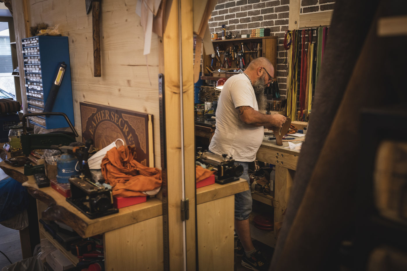 Reportage with Thierry, leather worker in Antibes. After having practiced different metier, Thierry, decided, following an accident, to live of his passion: The work of the leather. He opened in 2022 his workshop, near the sea in Antibes.