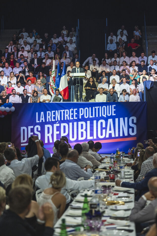 Le Cannet, FRANCE, 27 Aout 2023. Rentree politique du parti de Droite Les Républicains initialement prevu à Levens (06) delocalise a la Palestre au Cannet (06).