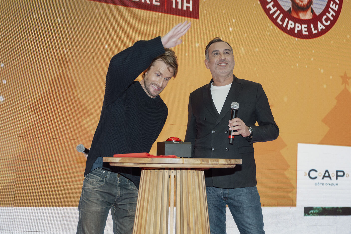 L’acteur Francais Philippe Lacheau et Frédéric Llorca, directeur de Cap 3000 à l’occasion du lancement des festivites de Noel du centre commercial CAP 3000, base a Saint Laurent du Var, dans les alpes maritimes.