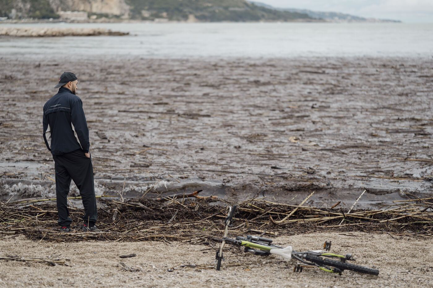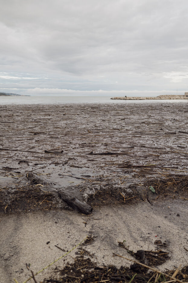 Image showing the beach and sea at Les Sablettes in Menton, southern France, covered with driftwood due to heavy rainfall the previous day. Menton, April 17, 2025.