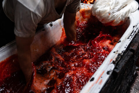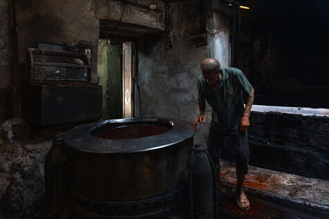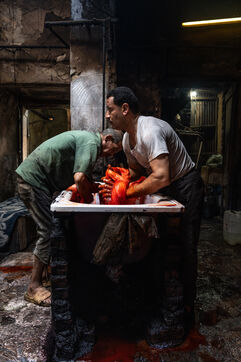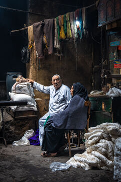 Dans cette teinturerie du quartier El Darb El Ahmar, fondée en 190, les artisans continuent toujours aujourd'hui de teindre les fils de façon traditionnelle, à la main, dans de grands bacs d'eau chaude, sous l'oeil expert de son propriétaire, Salama. Une fois teintés, les écheveaux de fils sont alors montés sur le toit où ils seront étendus pour sécher sur de longues tiges en bois.