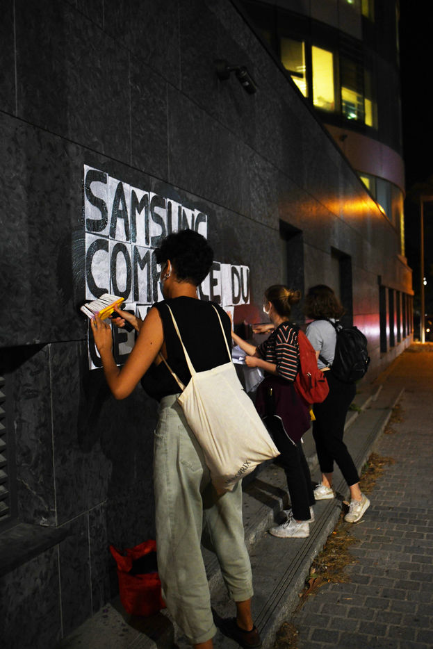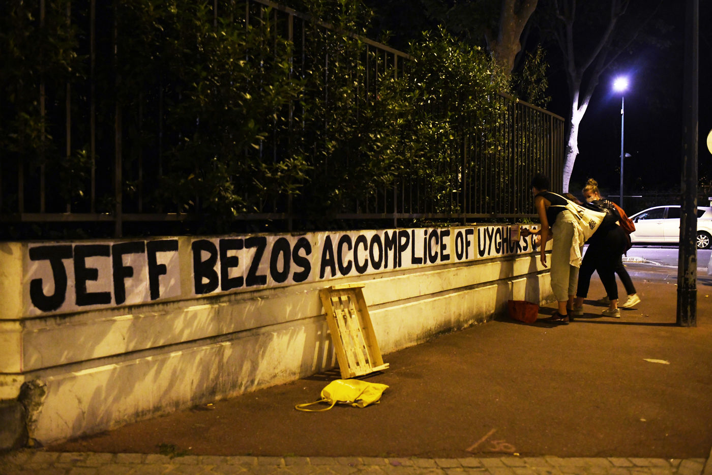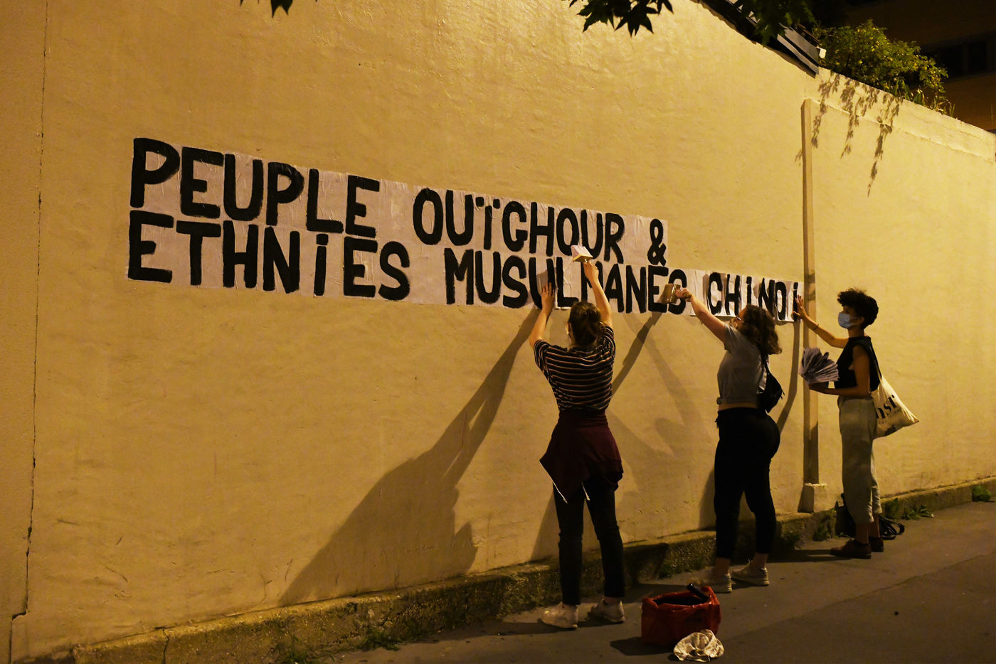 Dans la nuit, les membres du groupe Collages Féminicides Paris ont affiché sur les murs de grandes entreprises telles que Samsung et Amazon des messages dénonçant l'exploitation du peuple ouïghour dans leurs usines chinoises, ainsi que le génocide se déroulant actuellement dans le pays.