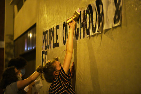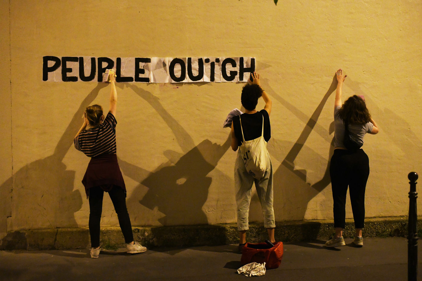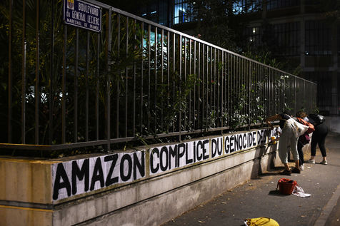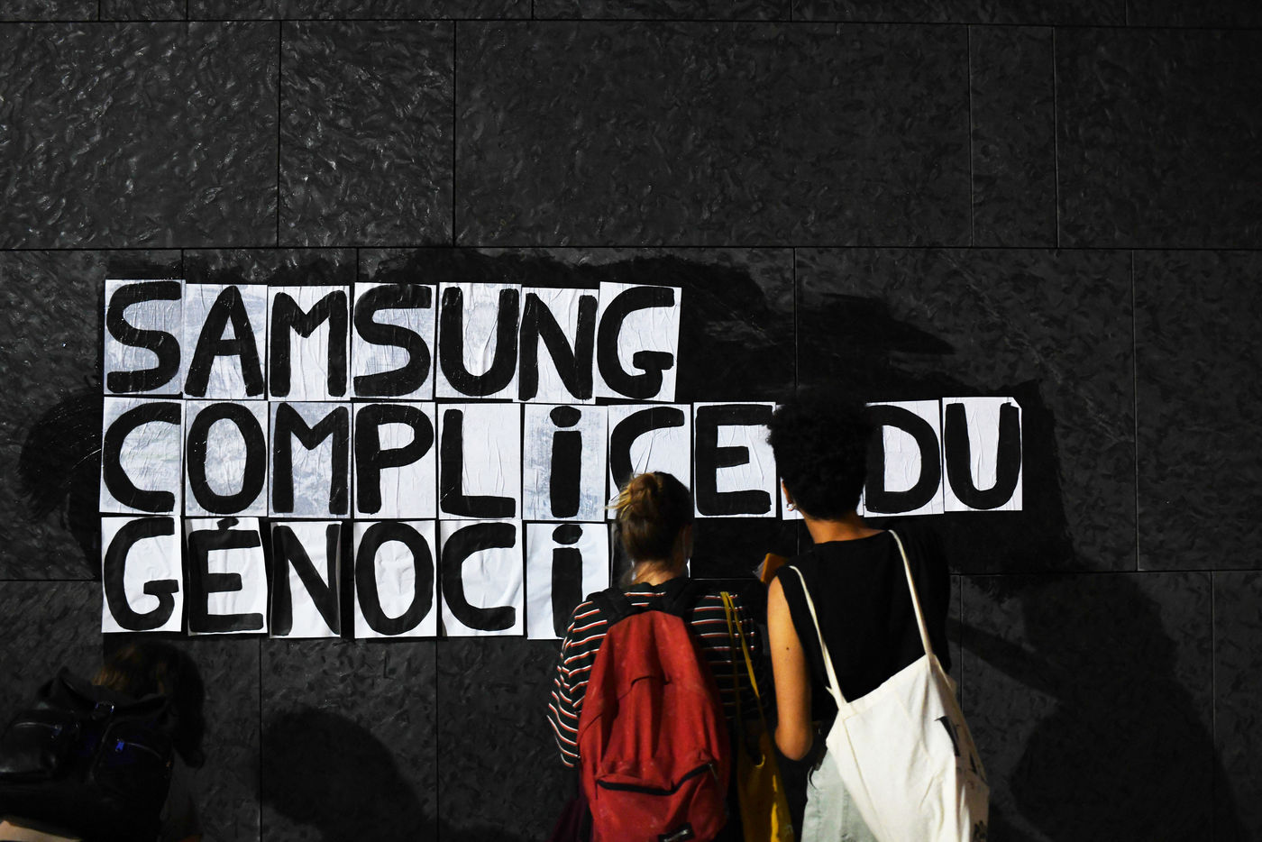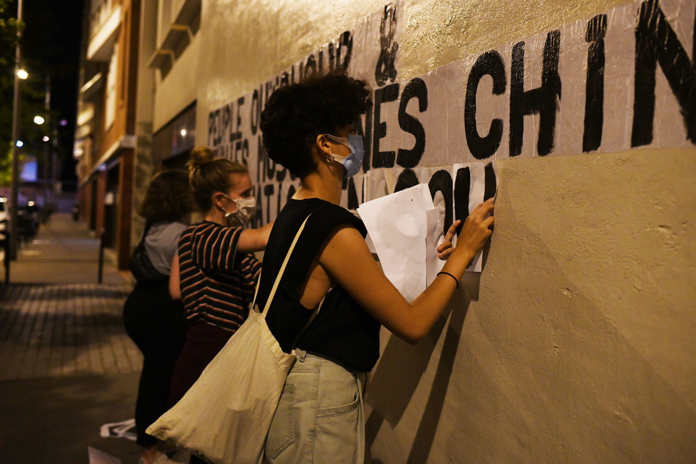 Dans la nuit, les membres du groupe Collages Féminicides Paris ont affiché sur les murs de grandes entreprises telles que Samsung et Amazon des messages dénonçant l'exploitation du peuple ouïghour dans leurs usines chinoises, ainsi que le génocide se déroulant actuellement dans le pays.