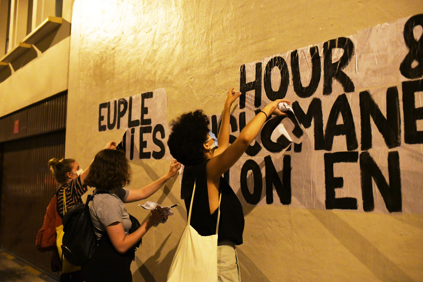 During the night, the members of the Collages Féminicides Paris group displayed messages on the walls of big companies such as Samsung and Amazon denouncing the exploitation of the Uyghur people in their Chinese factories, as well as the genocide currently taking place in the country.