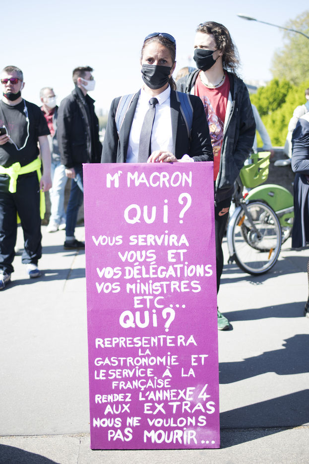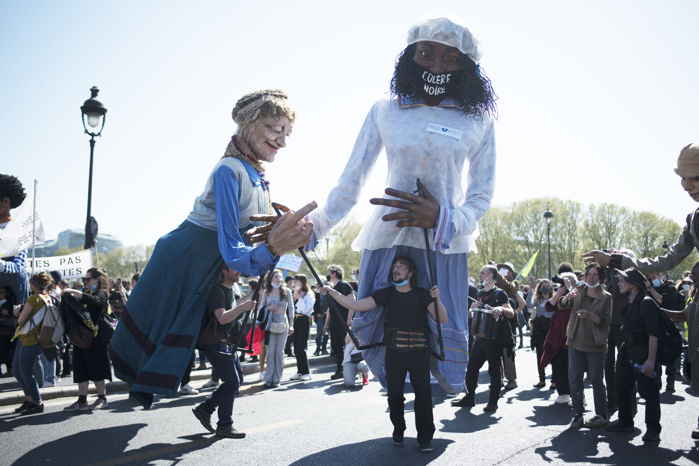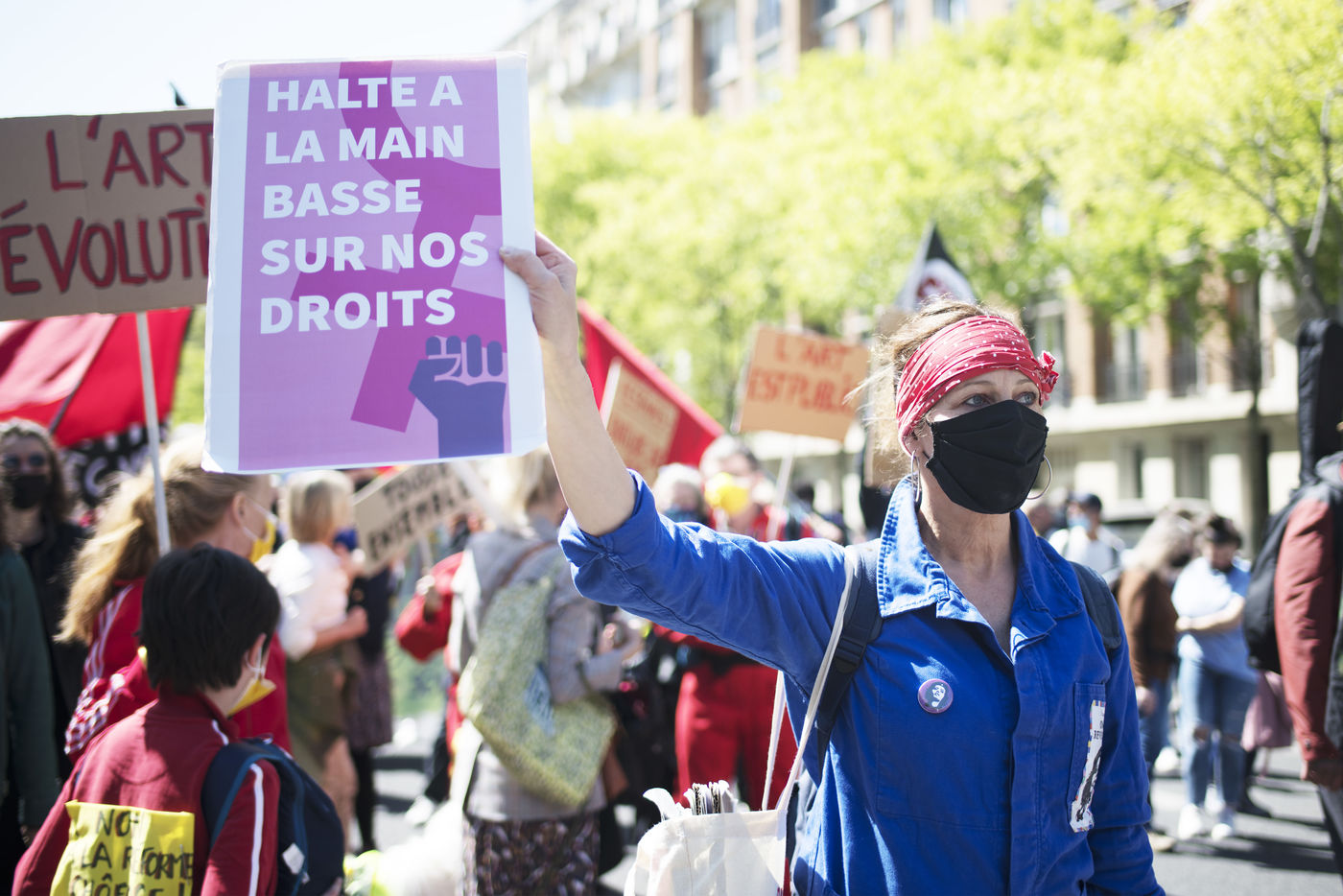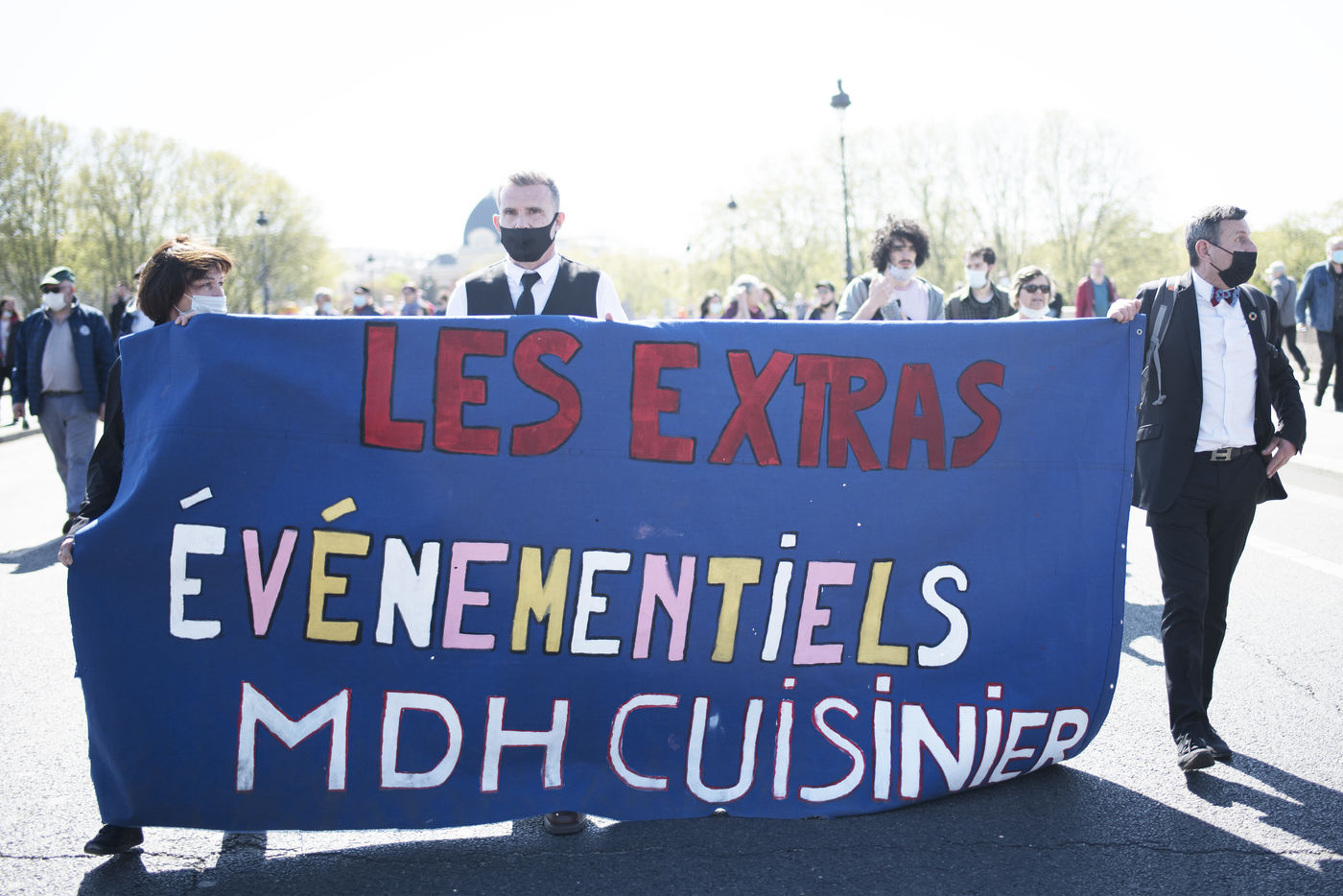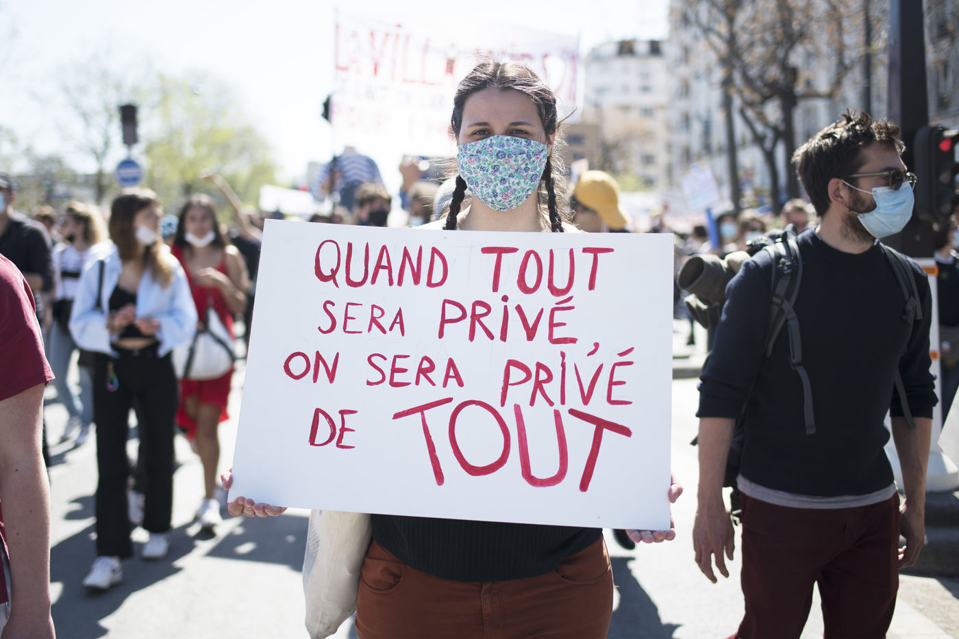 Manifestation contre la réforme de l'assurance chômage et les suppressions d'emplois entre place d'Italie et Bastille, le vendredi 23 avril 2021 à Paris.