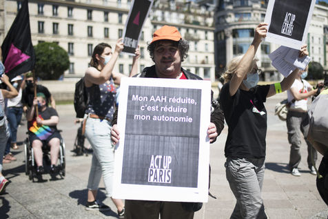 Gathering initiated by Act Up-Paris on the Place de l'Hôtel de Ville to demand that the calculation of the AAH Allocation Adulte Handicapée is no longer subject to the income of the partners of the persons concerned, on June 13, 2021, in Paris.