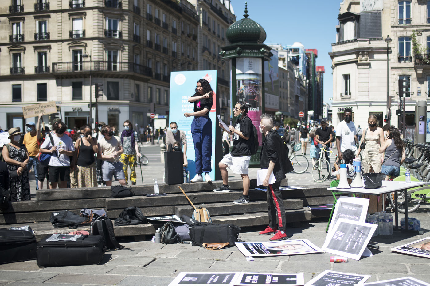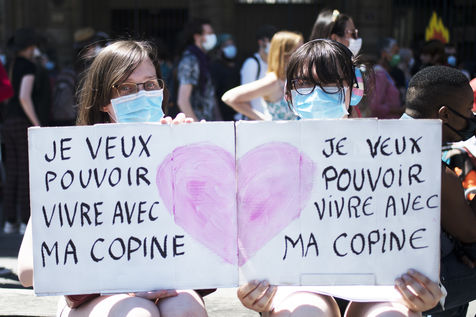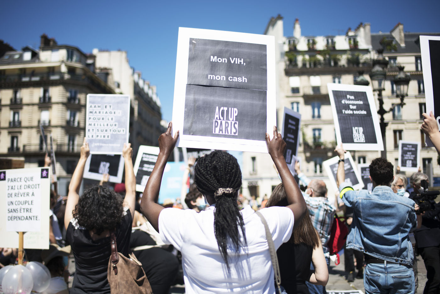 Rassemblement initié par Act Up-Paris sur la place de l'Hôtel de Ville pour demander que le calcul de l'AAH Allocation aux Adultes Handicapés ne soit plus assujetti au revenu des partenaires des personnes concernées, le 13 juin 2021, à Paris.