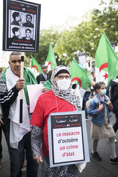 Demonstration commemorating the 60th anniversary of October 17, 1961 in Paris, between the Grand Rex and the Pont Saint-Michel. On October 17, 1961, the French police killed Algerian women, men and children who had come to demonstrate against colonialism. This state crime without memory left between 100 and several hundred people dead.