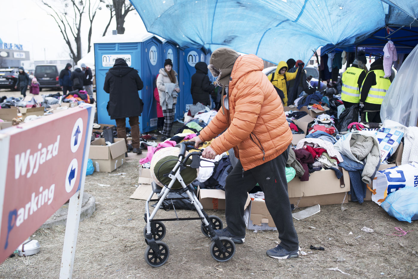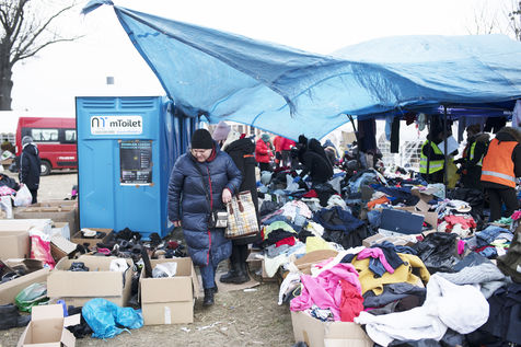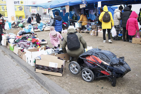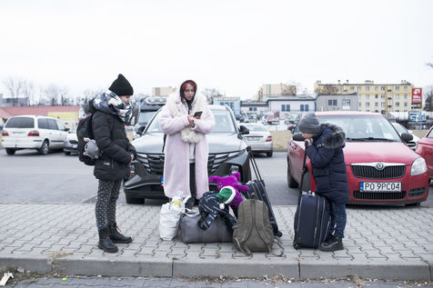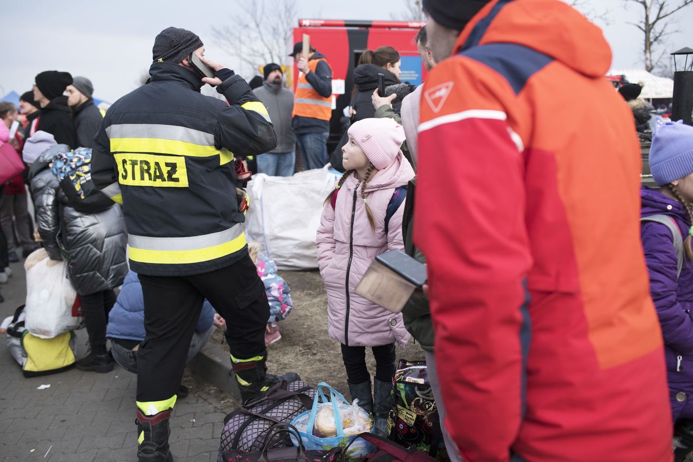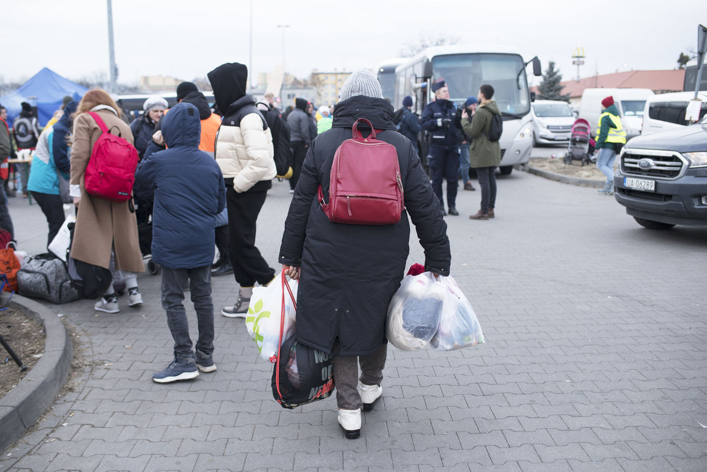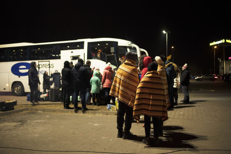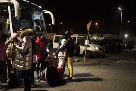 Ukrainian refugees are waiting for transport to leave Przemysl shortly after crossing the border between Ukraine and Poland. Several associations are present to help them. March 2nd 2022.
