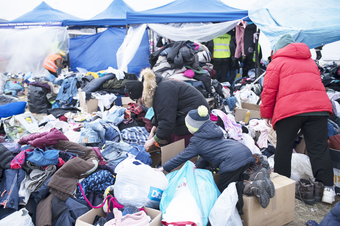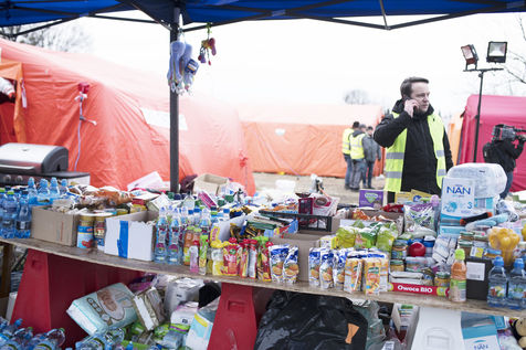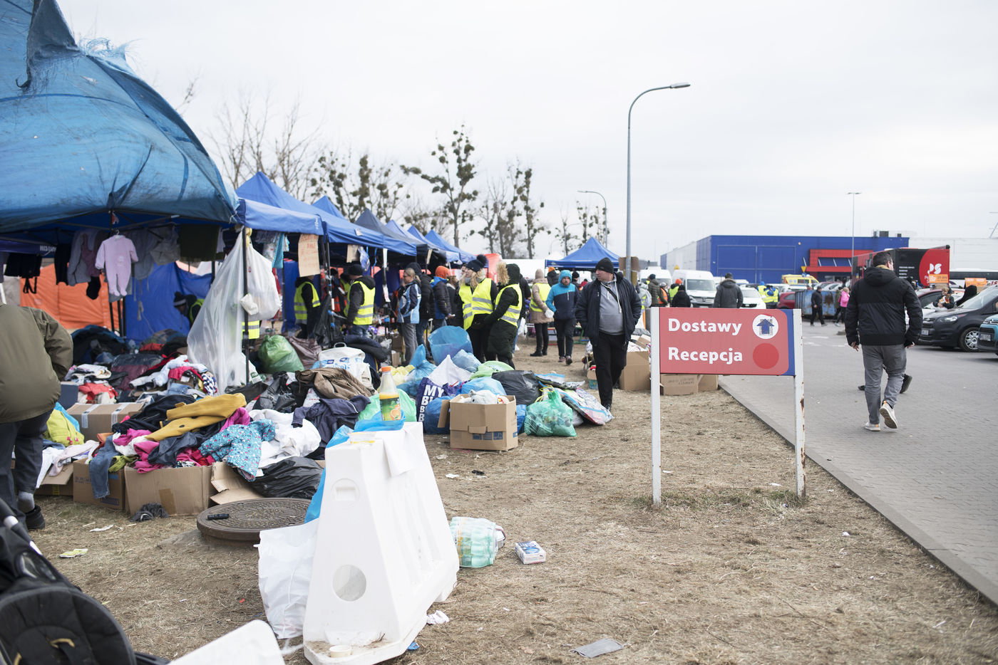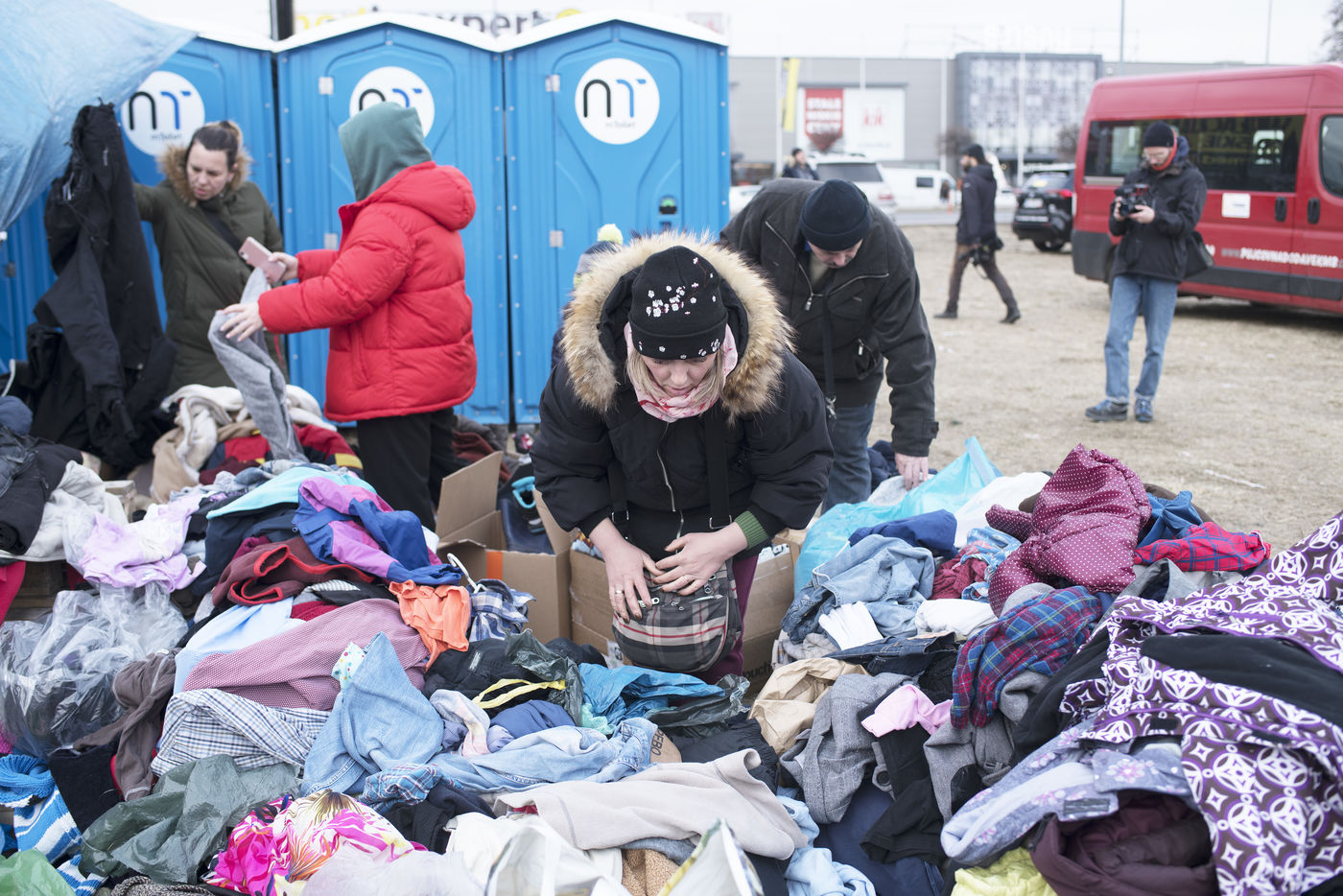 Ukrainian refugees are waiting for transport to leave Przemysl shortly after crossing the border between Ukraine and Poland. Several associations are present to help them. March 2nd 2022.