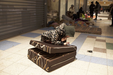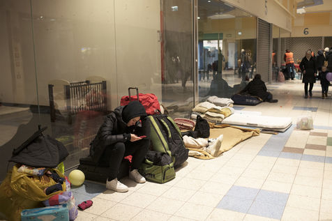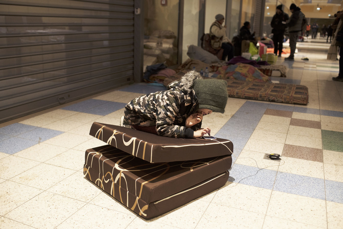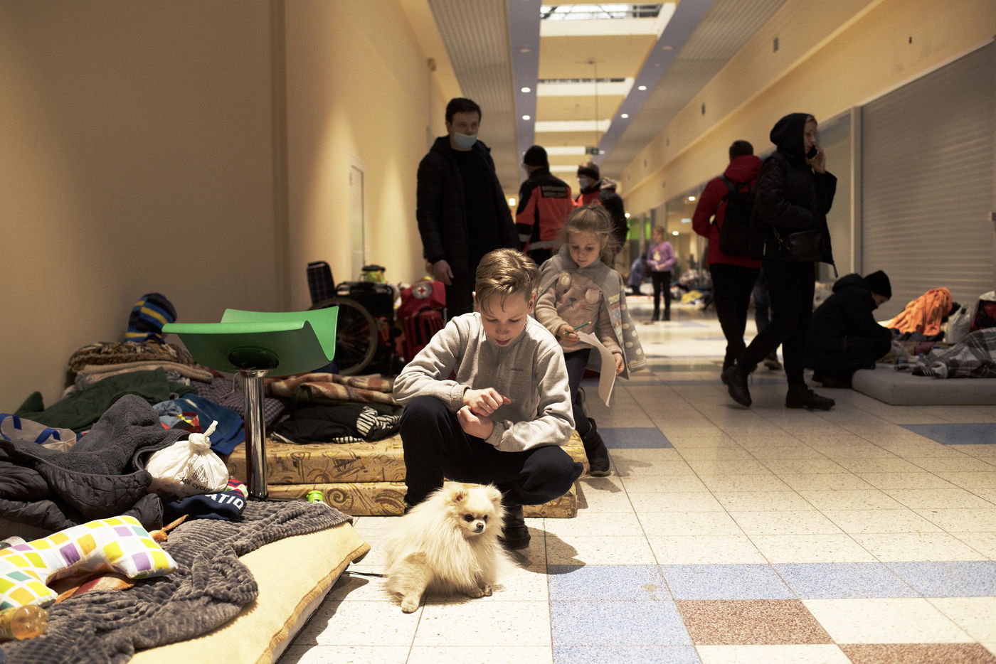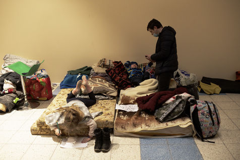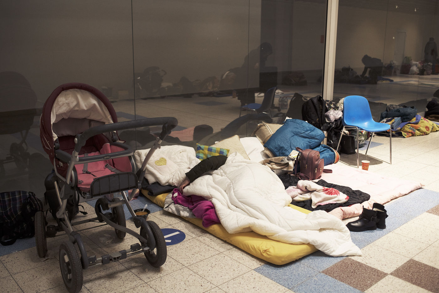 Ukrainian refugees wait for transport to leave Przemysl shortly after crossing the border between Ukraine and Poland. A shopping centre serves as a back-up accommodation for those who have to wait for sometimes several days. March 2, 2022, in Przemysl, Poland.