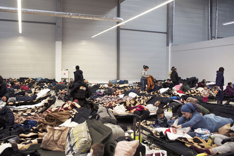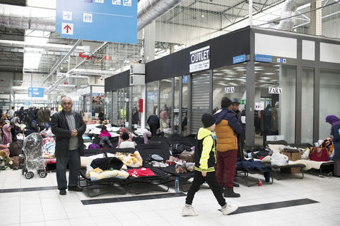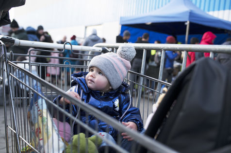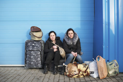Ukrainian refugees waiting to leave Mlyny after crossing the border between Ukraine and Poland