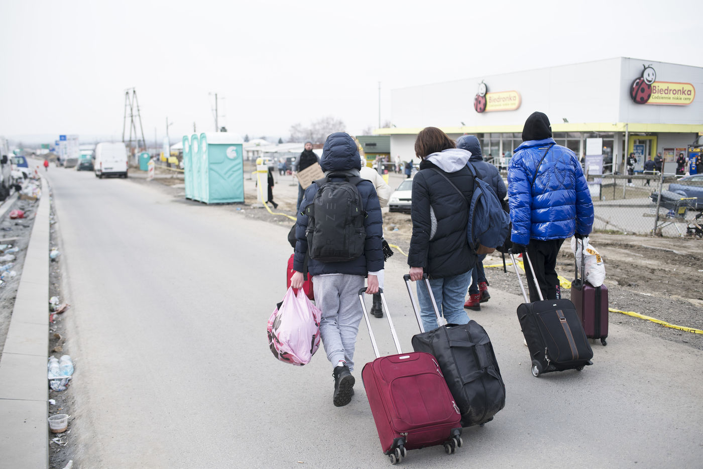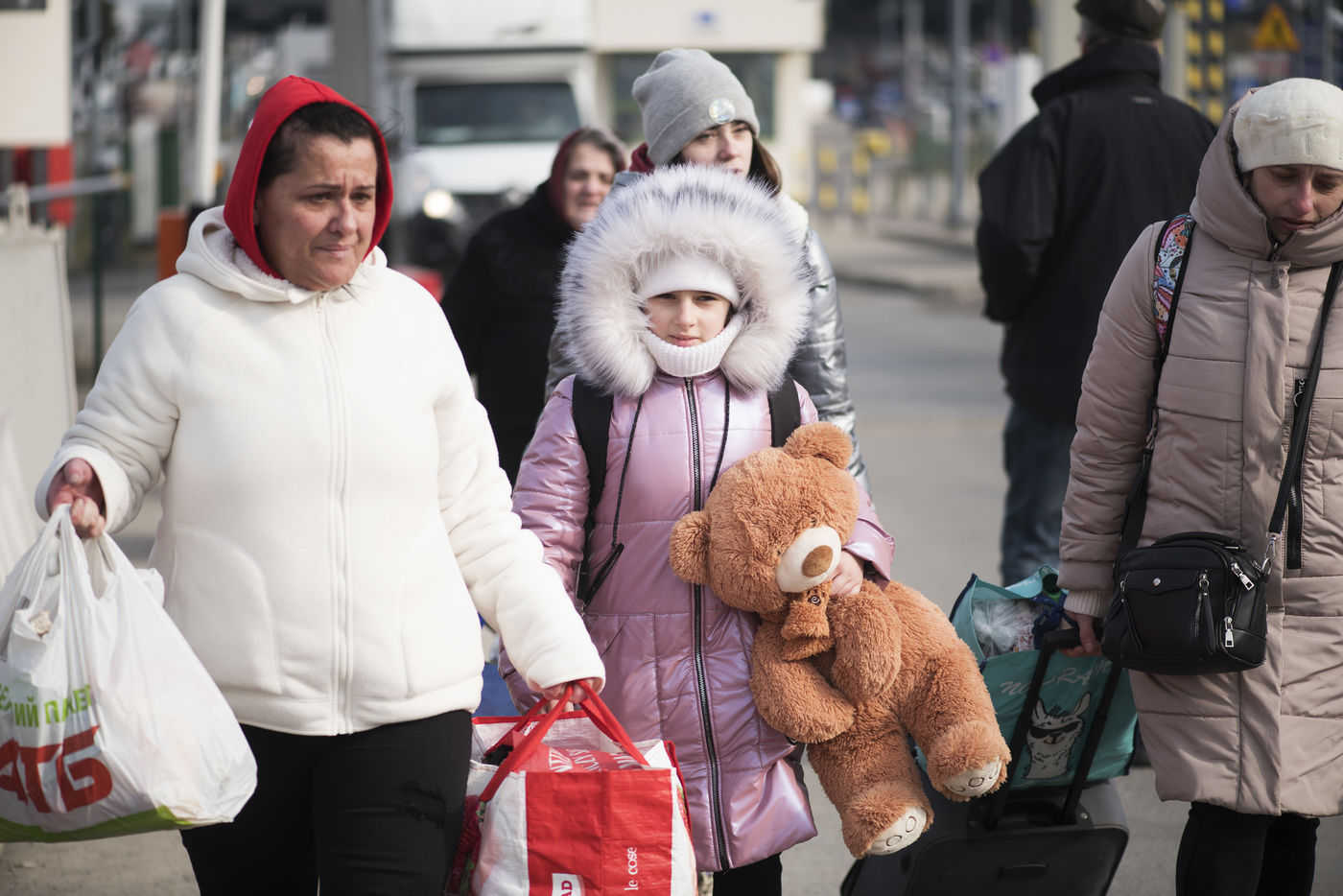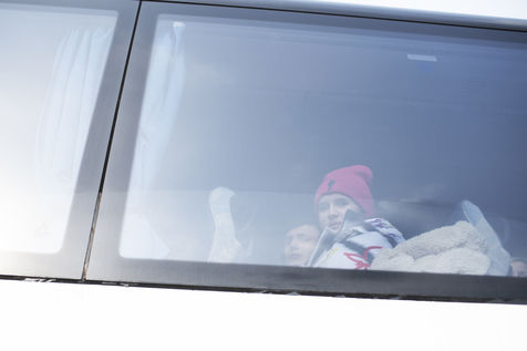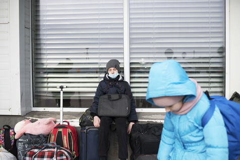 Ukrainian refugees wait for transportation to leave Medyka shortly after crossing the border between Ukraine and Poland. March 3, 2022.