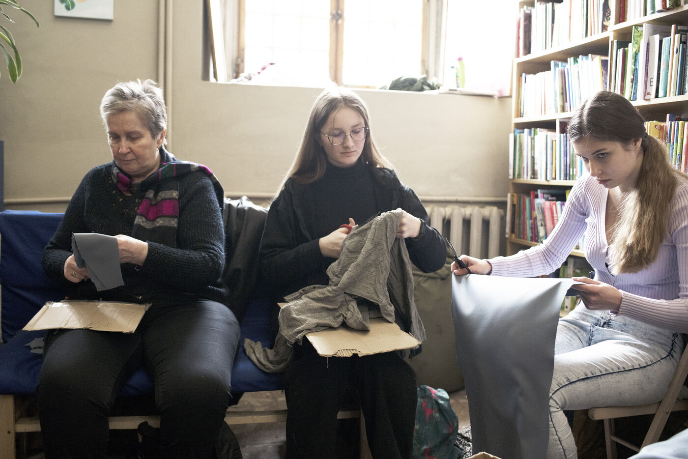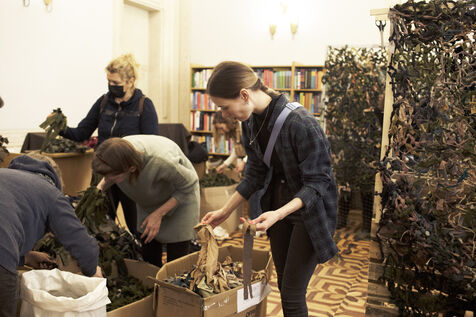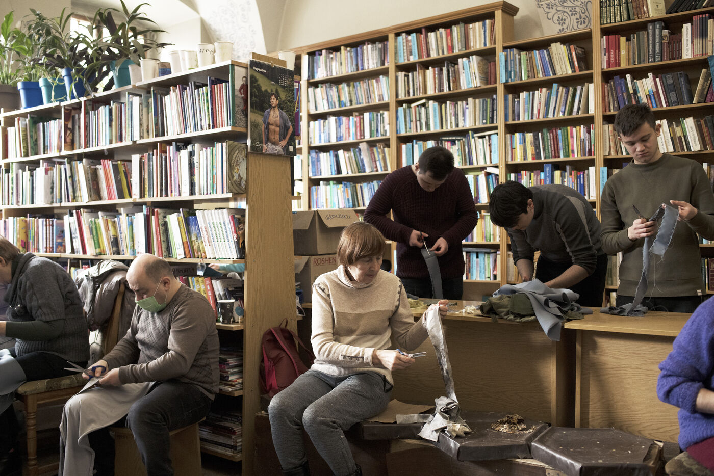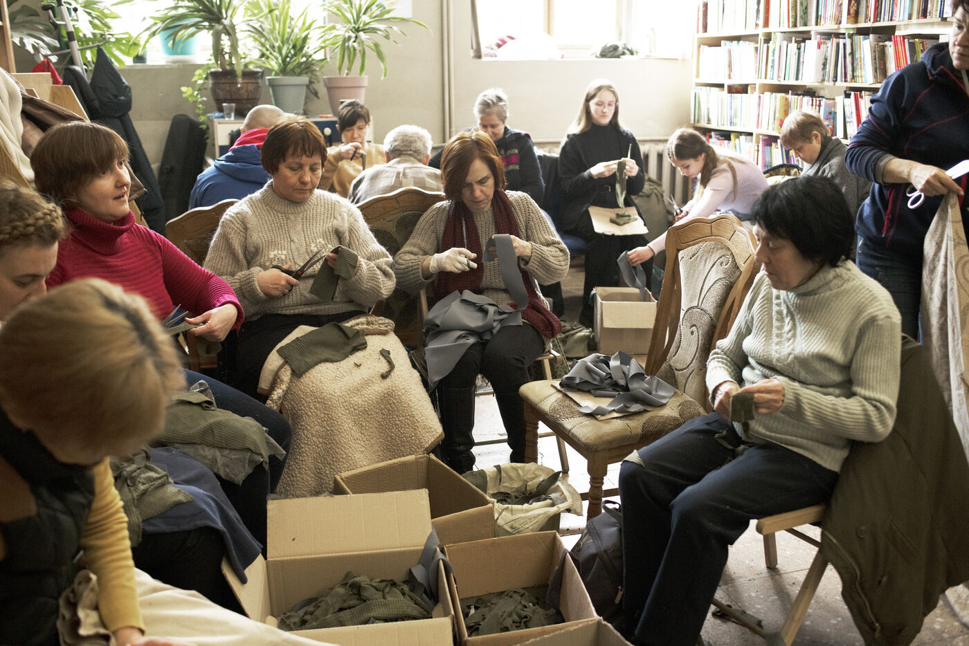 Volunteers gather in the library of the city of Lviv, Ukraine, to make camouflage nets to send to soldiers at the front in the east of the country, 10 March 2022.