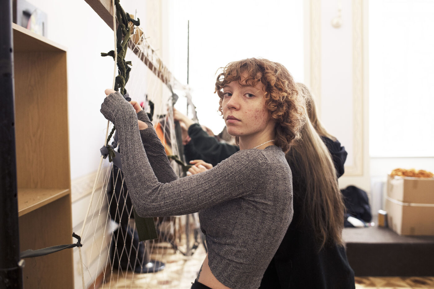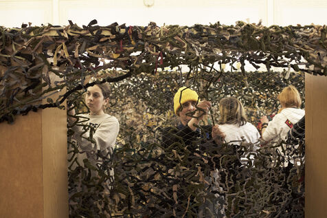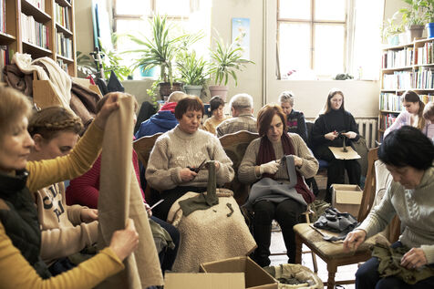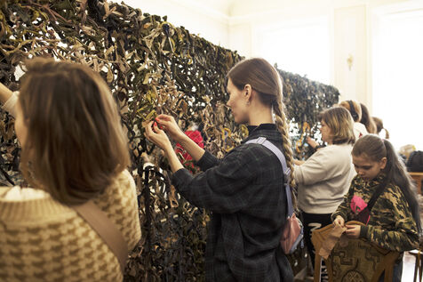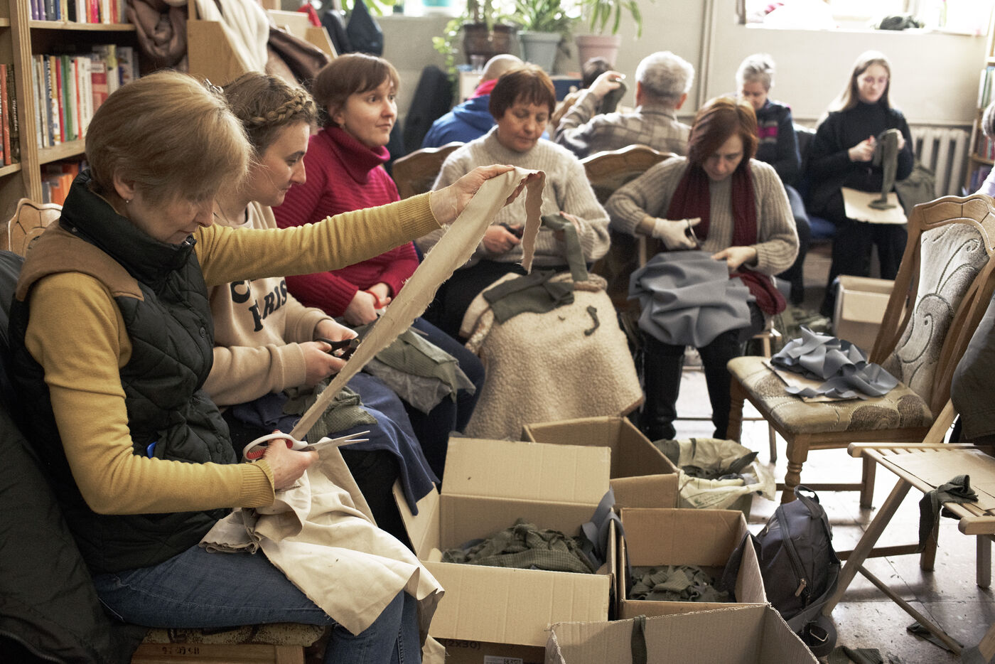 Volunteers gather in the library of the city of Lviv, Ukraine, to make camouflage nets to send to soldiers at the front in the east of the country, 10 March 2022.
