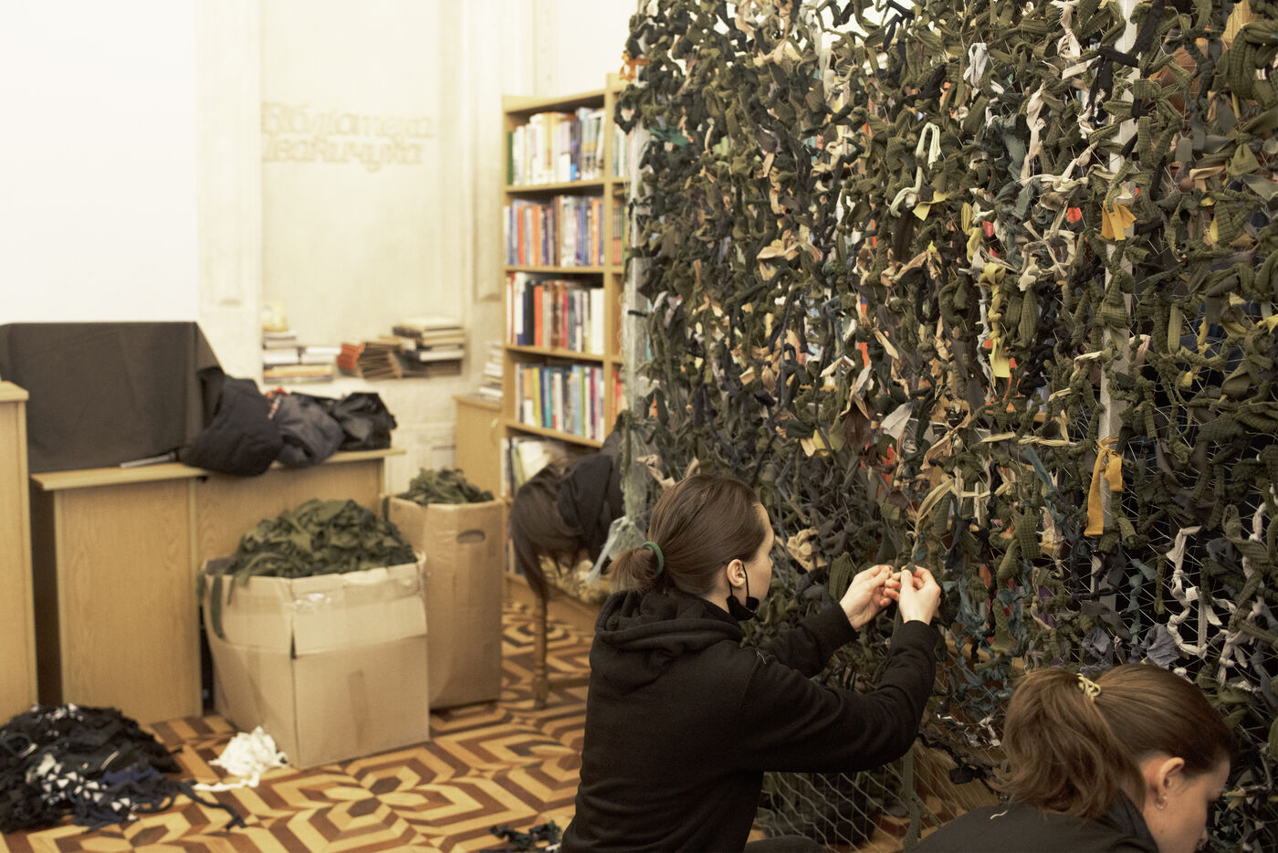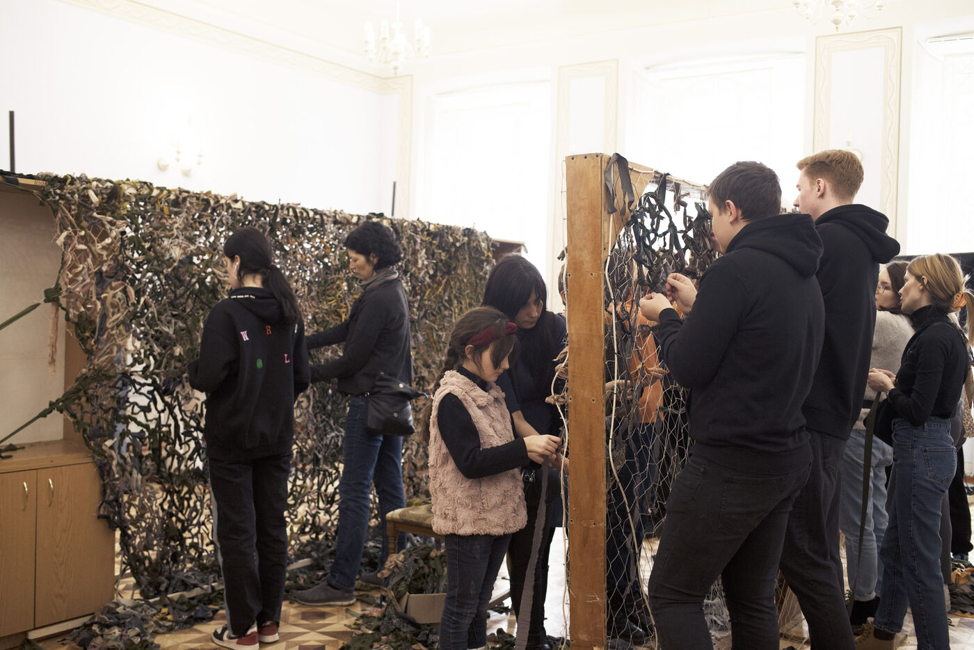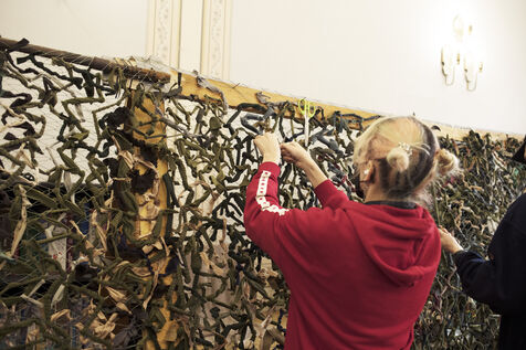 Volunteers make camouflage nets in Lviv for soldiers at the front in eastern Ukraine