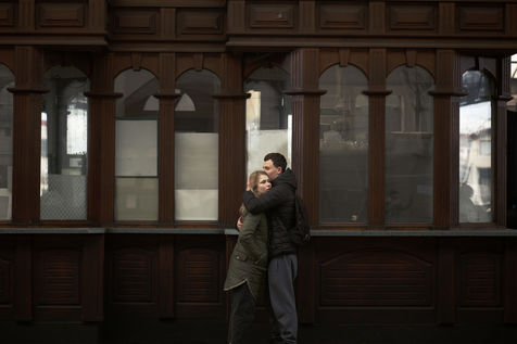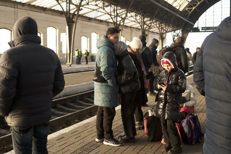 Ukrainian men say goodbye to their lovers before they take a train from Lviv station to leave the country and flee the war. All men from 18 to 60 are forbidden to leave the country.