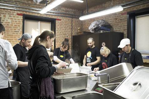 Des volontaires préparent des repas pour les réfugiés venus de l'Est de l'Ukraine